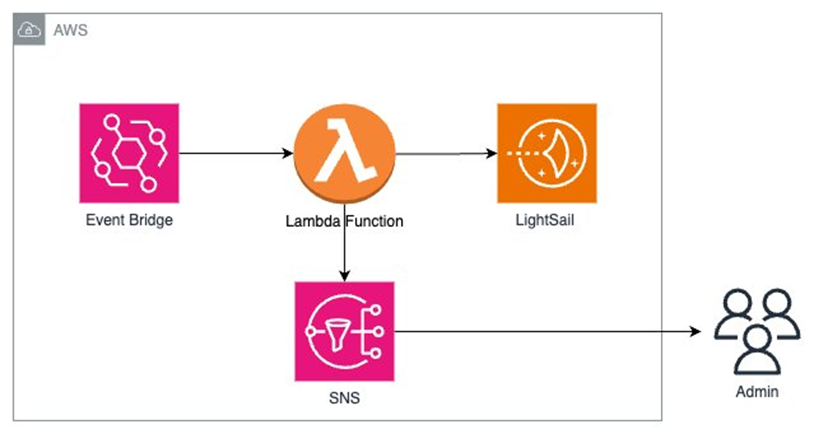这个方案架构较为简单,直接使用Event Bridge来进行定时任务触发,使用Lambda来进行逻辑检测和自动扩容逻辑,使用SNS来进行通知