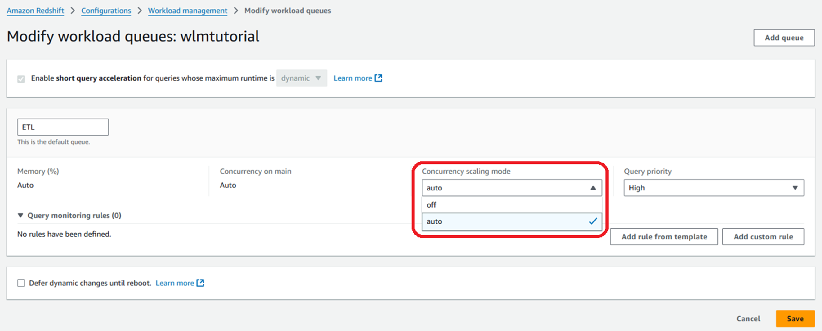 在Amazon Redshift console -> Configurations -> Workload management,找到该队列,将Concurrency scaling mode设置成auto(默认是off)。