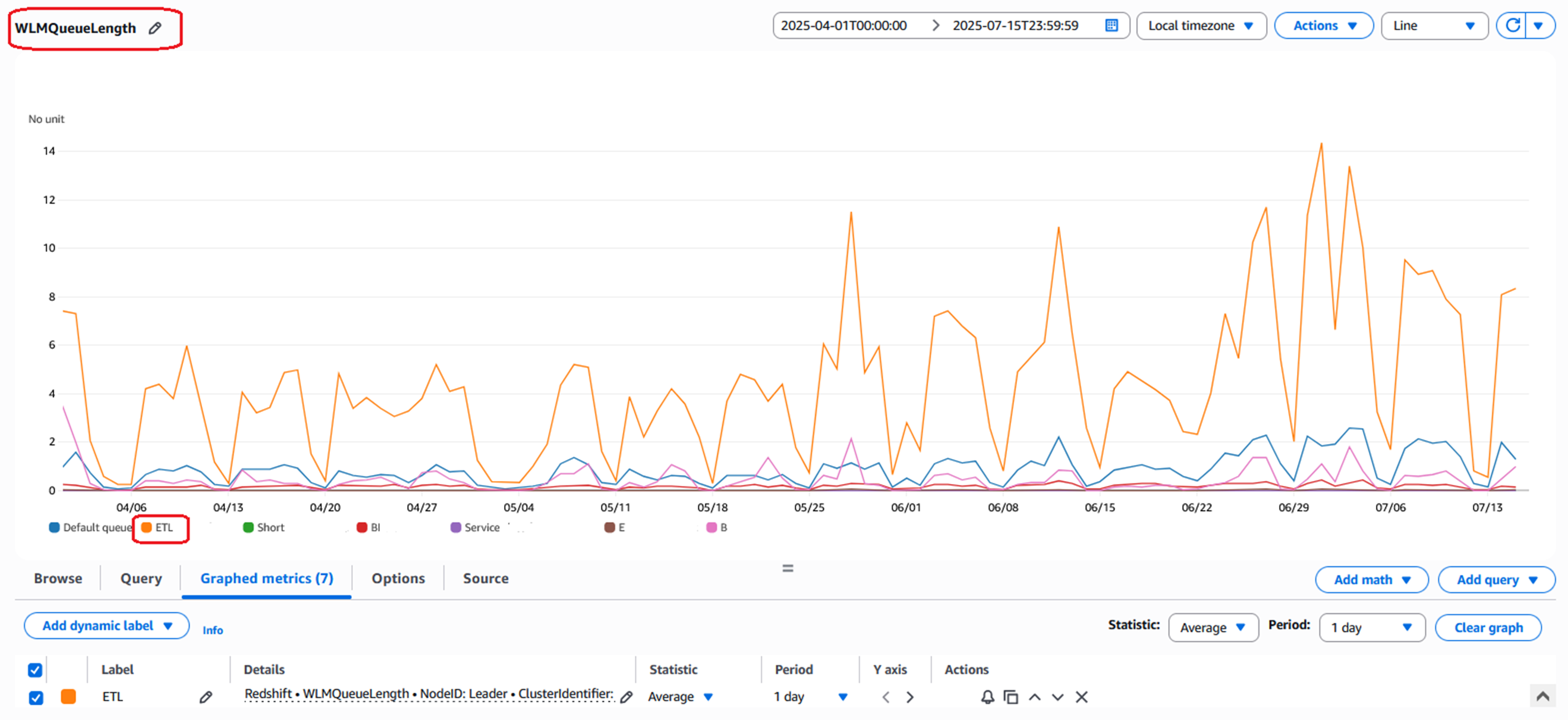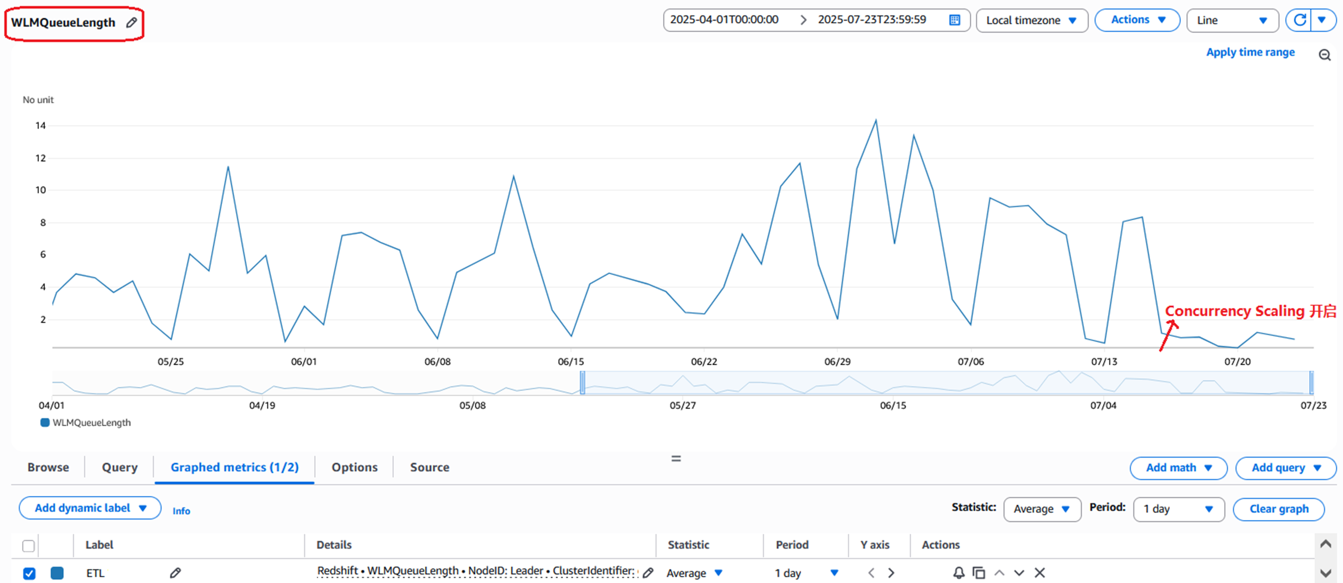 首先,在开启并发扩展之前,请借助WLMQueueLength指标来找到队列最长的WLM队列:CloudWatch -> Redshift -> ClusterIdentifier, QueueName -> MLMQueueLength。