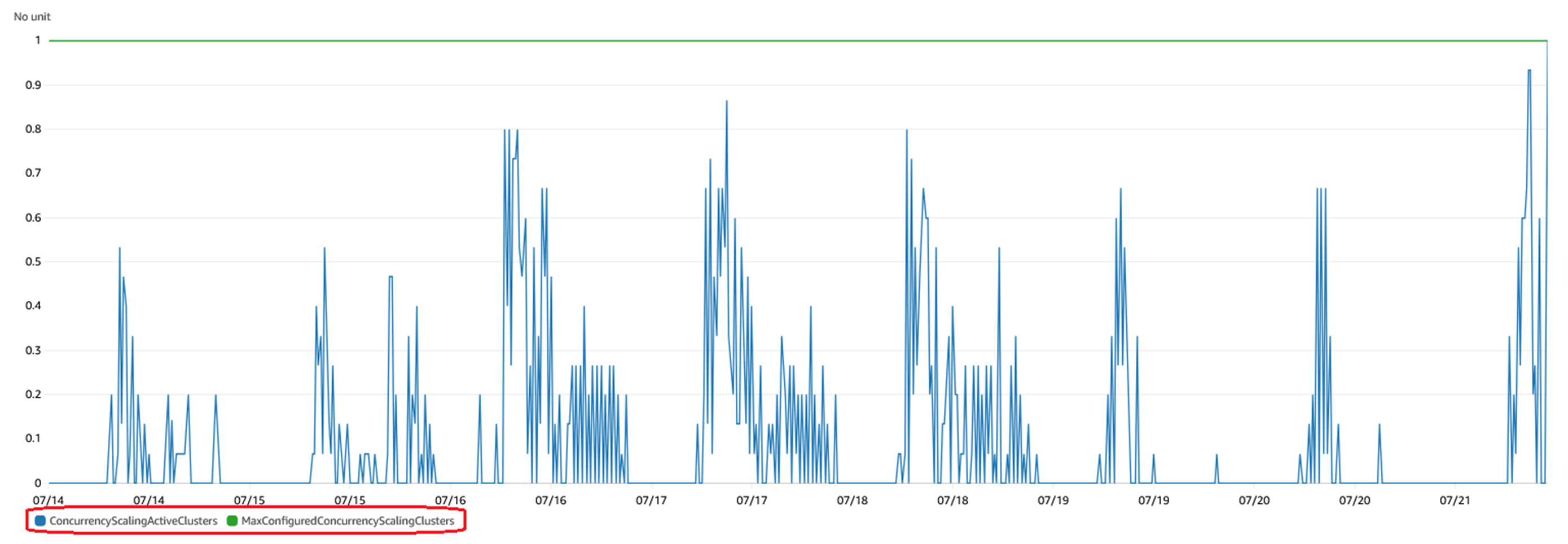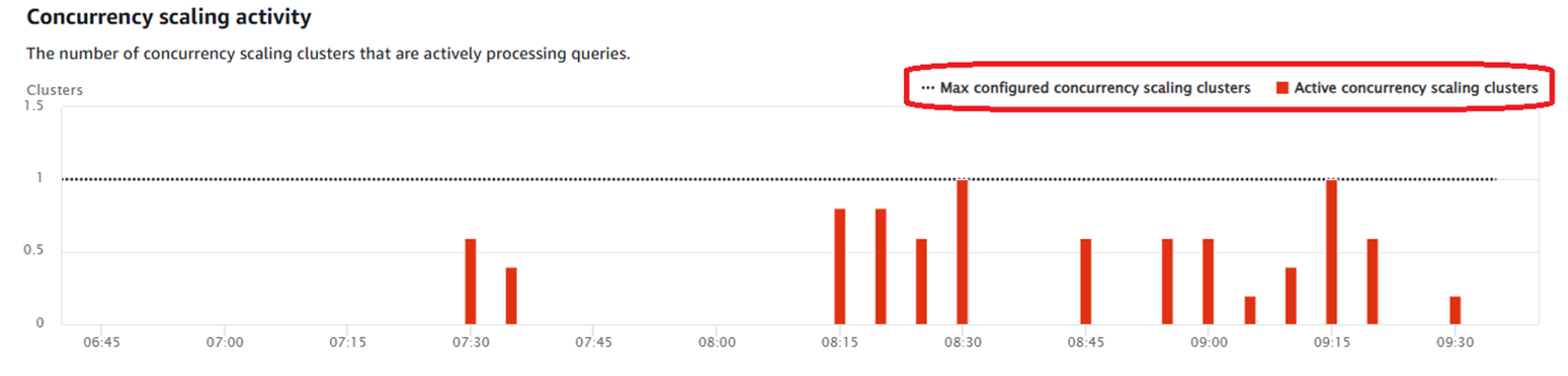 ConcurrencyScalingActiveClusters:正在运行的并发扩展集群。如果该指标的值小于1(例如5),可能是CloudWatch中指标的聚合方式导致的。例如,如果查询的时间范围内扩展集群并非全程活跃,计算平均值时可能会出现小数(比如:在5分钟内,扩展集群运行了2.5分钟,该指标的平均值就是0.5)。