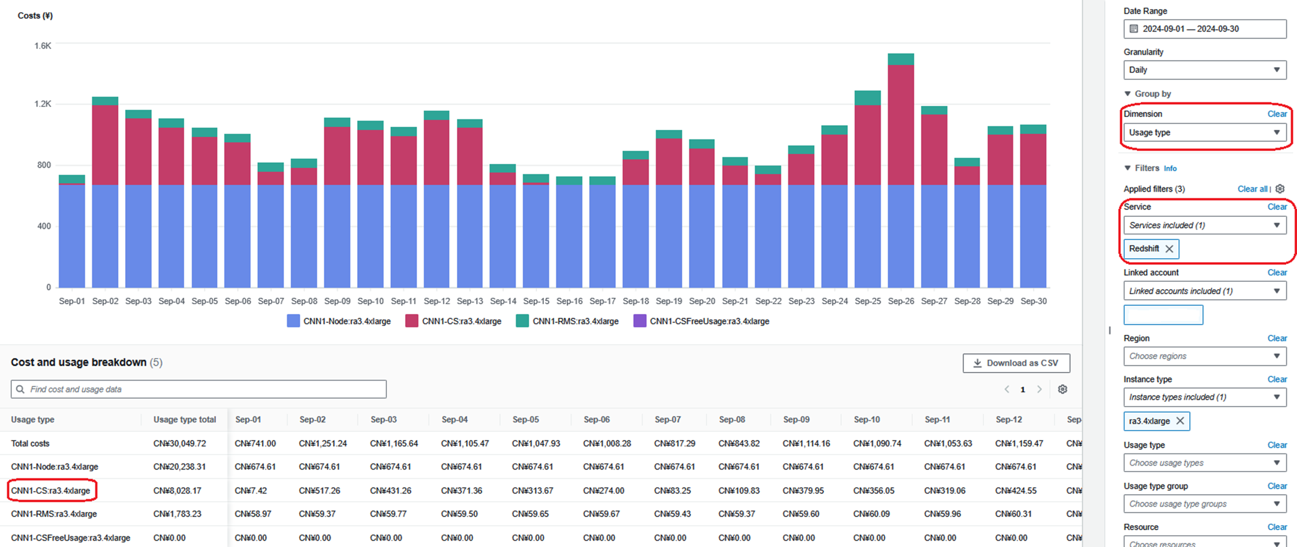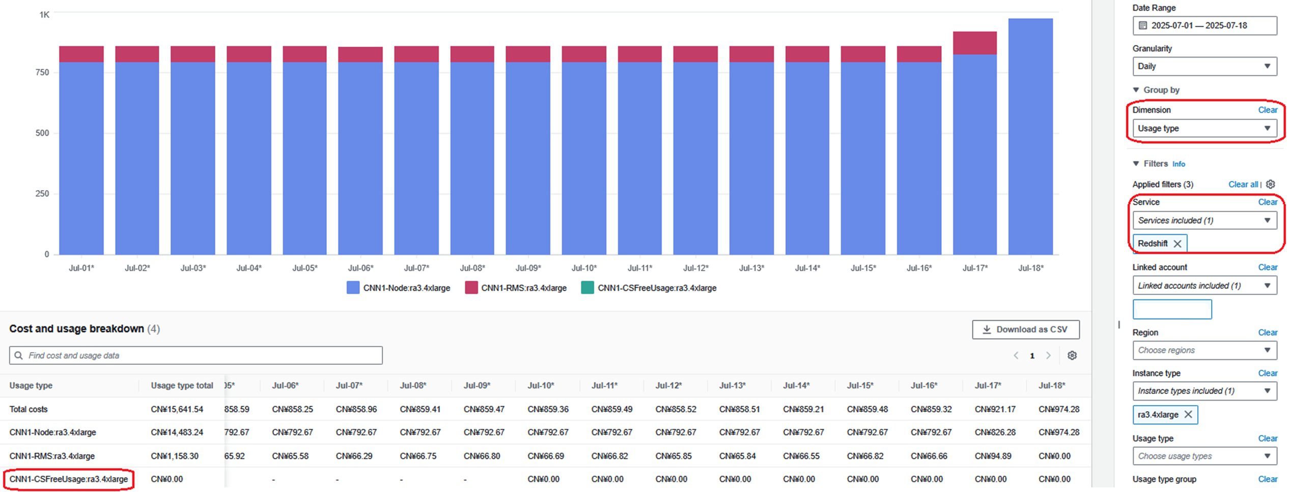 在Amazon Cost Explorer中也可以确认未额外收费(CNN1-CSFreeUsage:ra3.4xlarge)。
