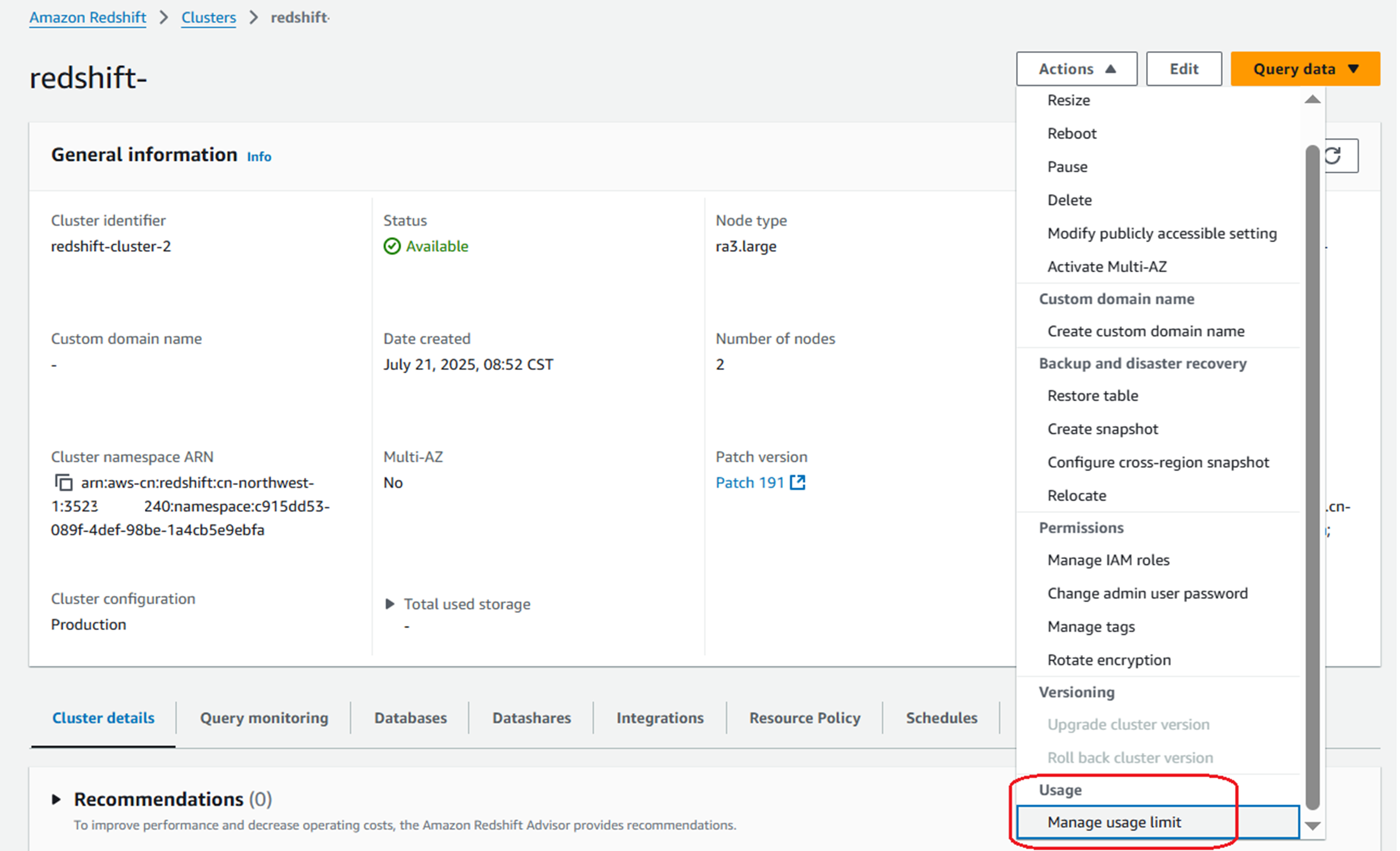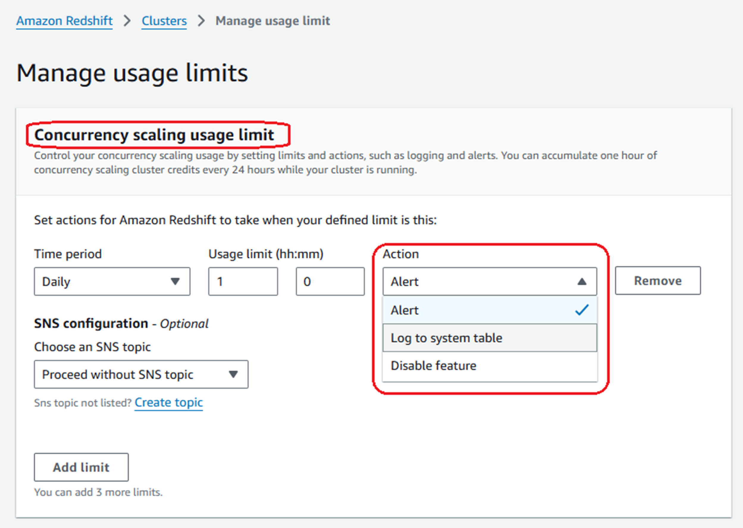 在Amazon Redshift集群层面上,可以配置Concurrency Scaling Usage Limit的来监控、控制费用。