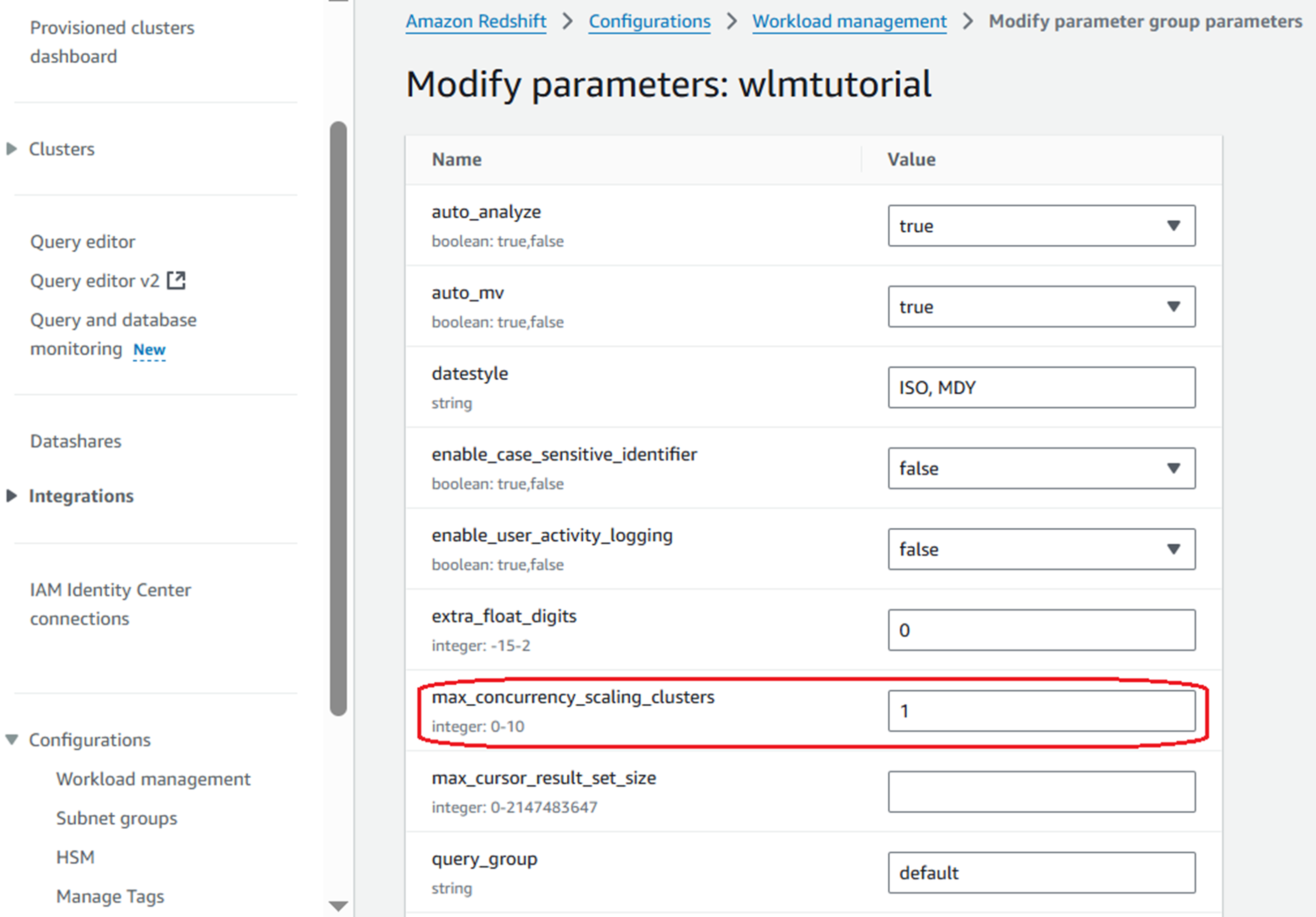 可以在Amazon Redshift console -> Configurations -> Workload management 页面上查看和修改参数max_concurrency_scaling_clusters 的值。