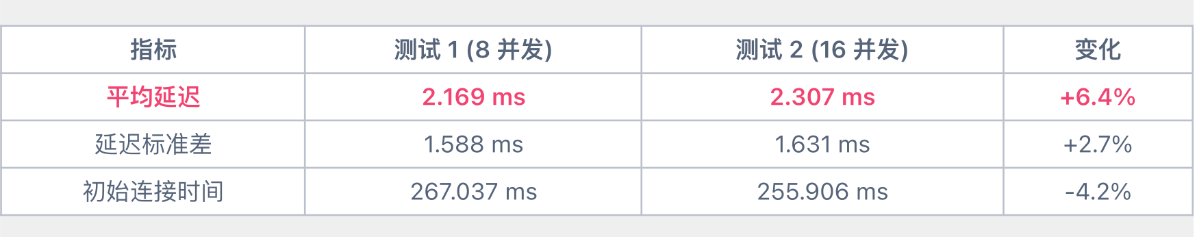 2. 延迟控制良好: 高并发下延迟增幅控制在可接受范围,标准差控制在较低水平,说明延迟波动不大。