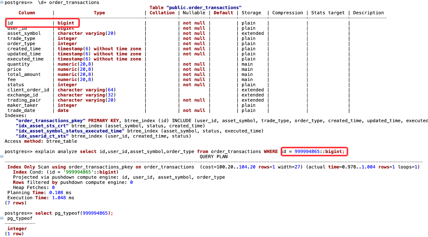 目前 Amazon Aurora DSQL 对数值类型做等值查询也会存在类型一致性要求,比如integer=bigint,索引下推不会生效,需要显示进行一致类型转换,类型自动转换功能已计划支持。