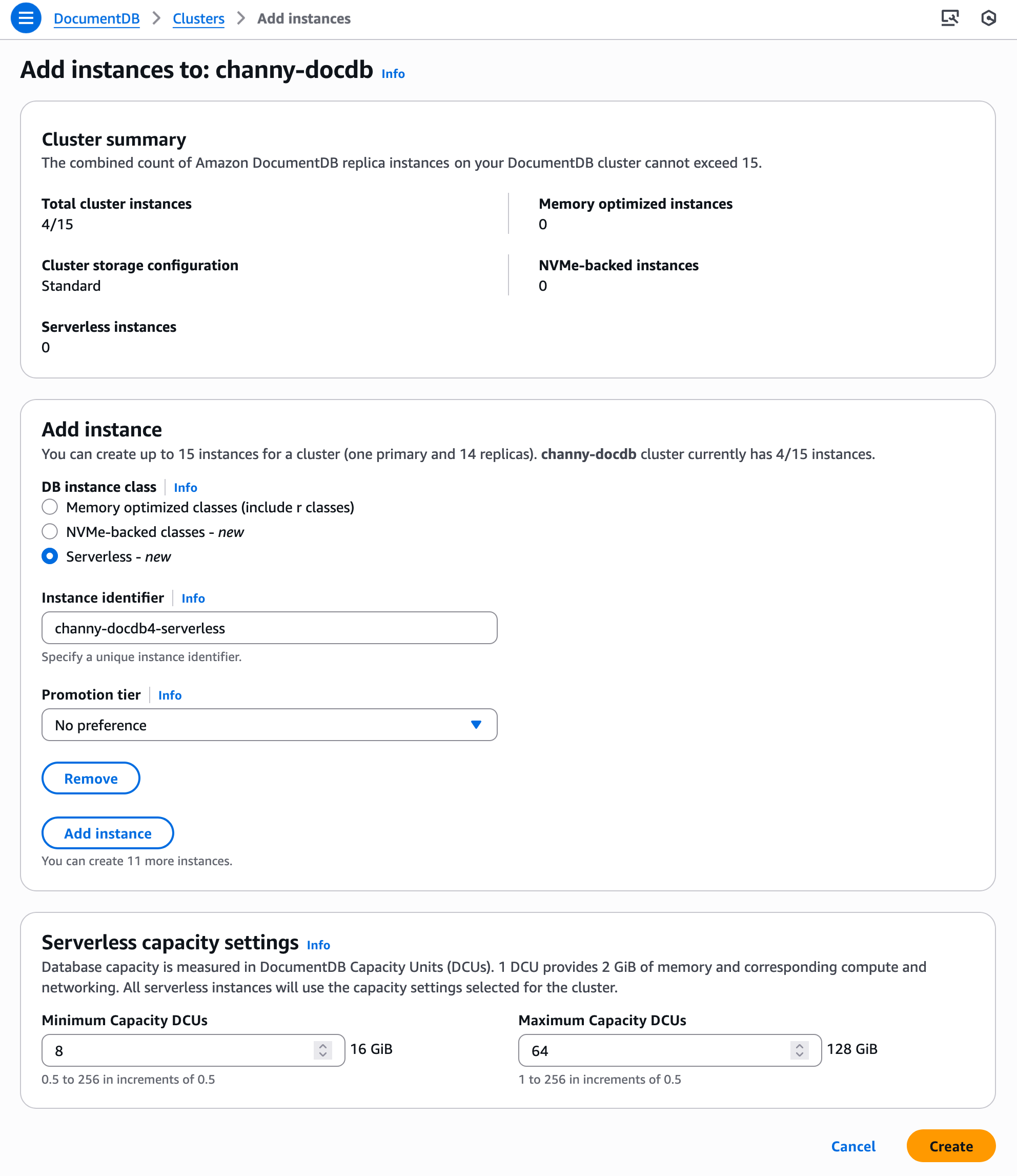 要了解更多信息,请访问 AWS 文档中的创建使用 Amazon DocumentDB Serverless 的集群和管理 Amazon DocumentDB Serverless。