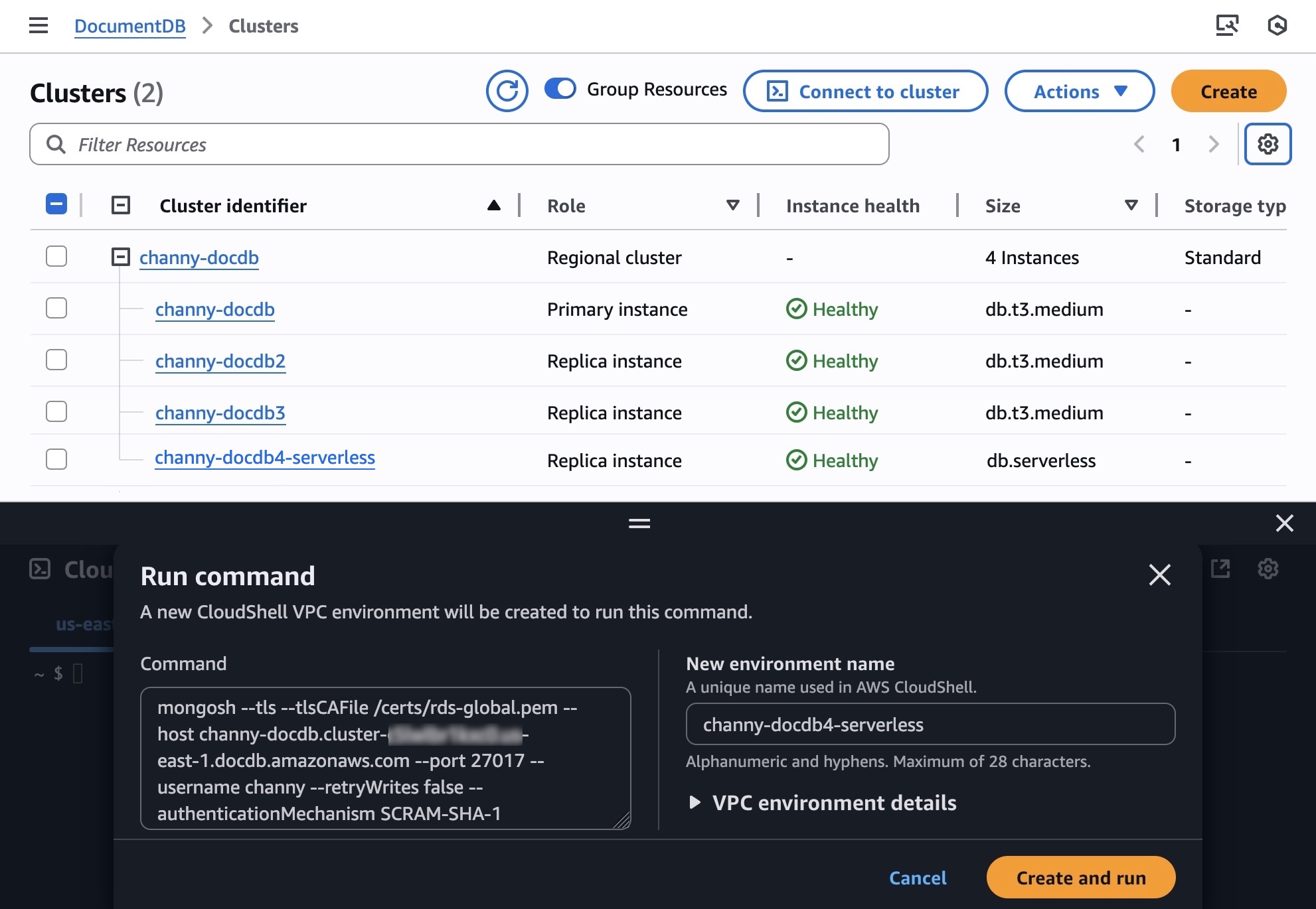 现在,可以使用 AWS CloudShell 连接到 Amazon DocumentDB 集群。选择连接到集群,即可看到 AWS CloudShell 运行命令屏幕。在新建环境名称中输入一个唯一名称,然后选择创建并运行。