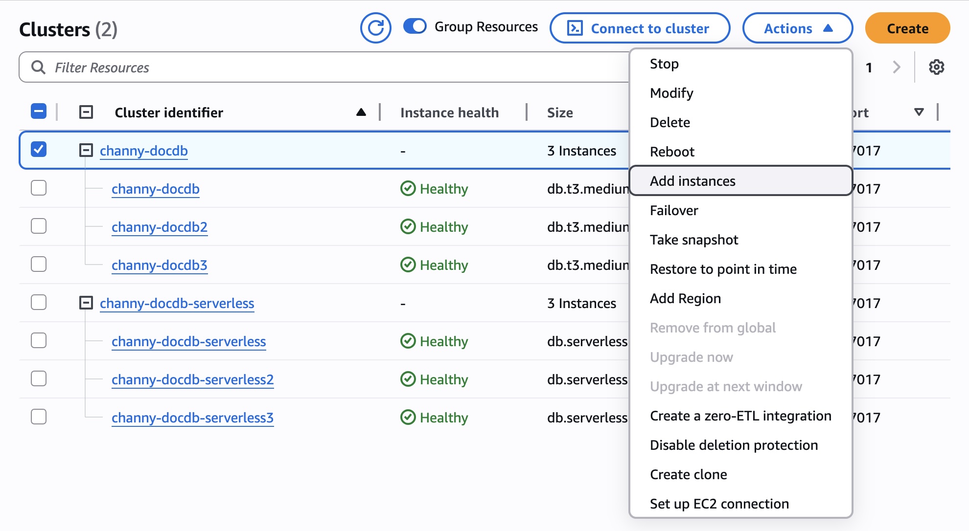要向现有的预置集群添加无服务器实例,请在选择已预置的集群时在操作菜单上选择添加实例。如果使用的是早期版本(例如 3.6 或 4.0)的集群,则应首先将集群升级到支持的引擎版本(5.0)。