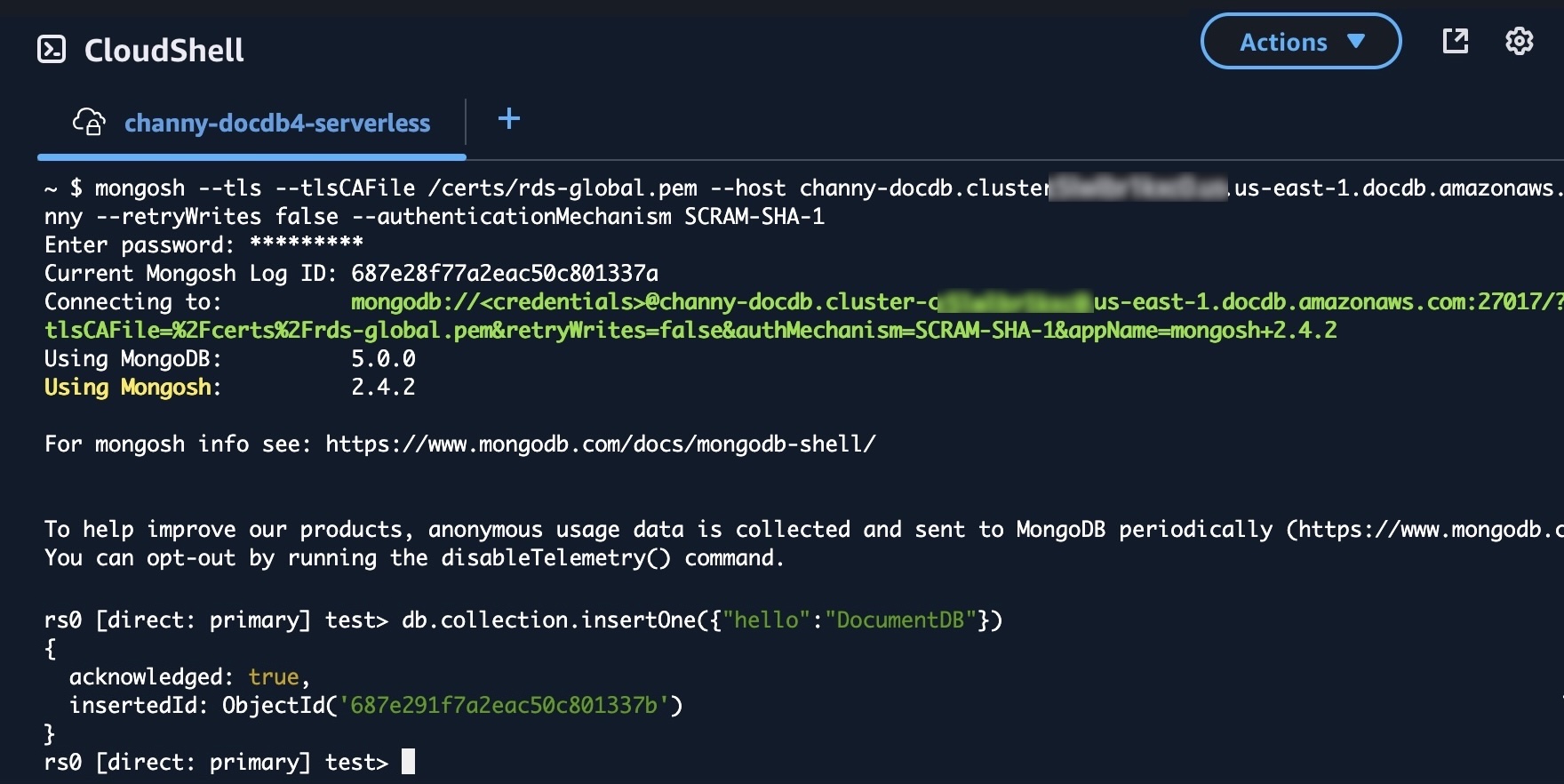 出现提示时,输入 Amazon DocumentDB 集群的密码。已成功连接到 Amazon DocumentDB 集群,可以运行一些查询来熟悉使用文档数据库。
