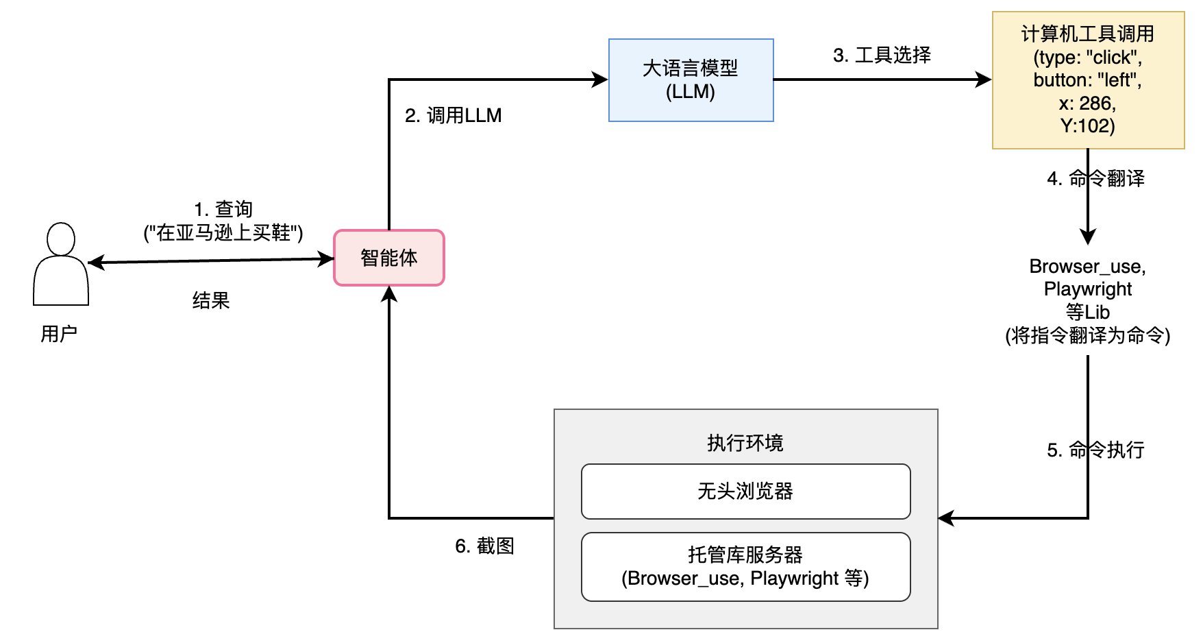 除了代码执行,Agent应用的另一个重要应用场景是Computer Use(计算机使用)和Browser Use(浏览器使用)。Computer Use是指AI Agent能够像人类用户一样操作计算机界面,包括点击按钮、输入文本、拖拽文件等各种GUI操作。Browser Use则是Computer Use的重要场景,专门指Agent在浏览器环境中的自动化操作能力,如网页浏览、表单填写、数据抓取等。