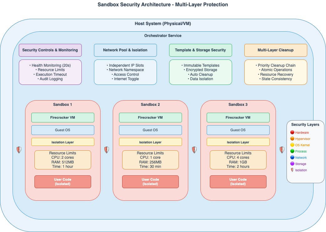 (1) 虚拟化隔离: 如亚马逊云科技开源主导的 Firecracker 微虚拟机技术提供了硬件级别的隔离。每个沙盒运行在独立的虚拟机中,与宿主机和其他沙盒完全隔离,防止代码突破容器边界,实现真正的安全执行环境。