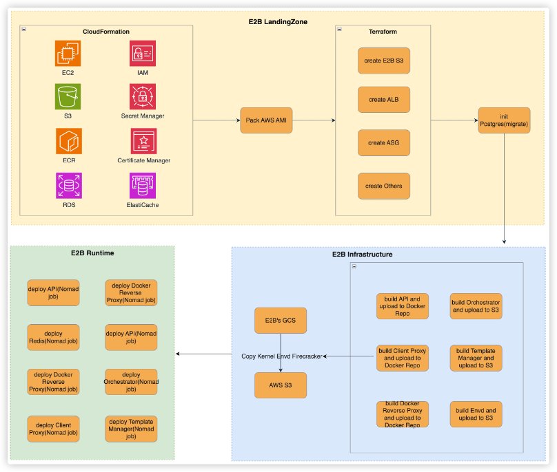 为了简化E2B官方的复杂部署流程,我们将E2B on AWS的部署重构为下述3大核心部分: