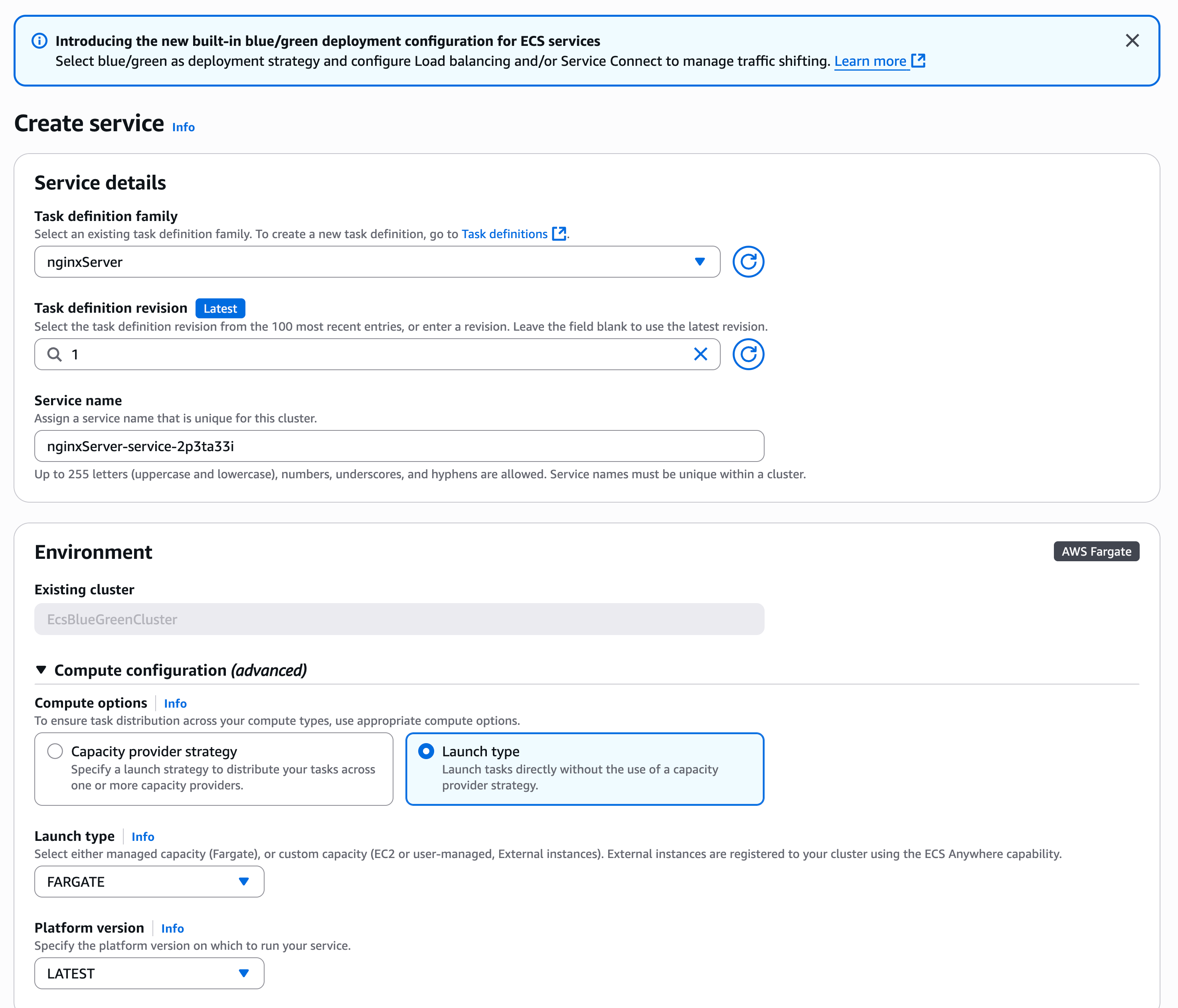 通过 Amazon ECS 控制台,我像往常一样创建一个新服务并进行配置: