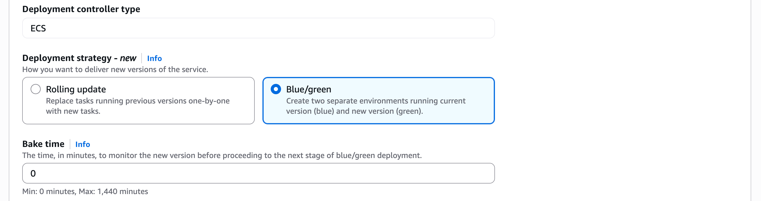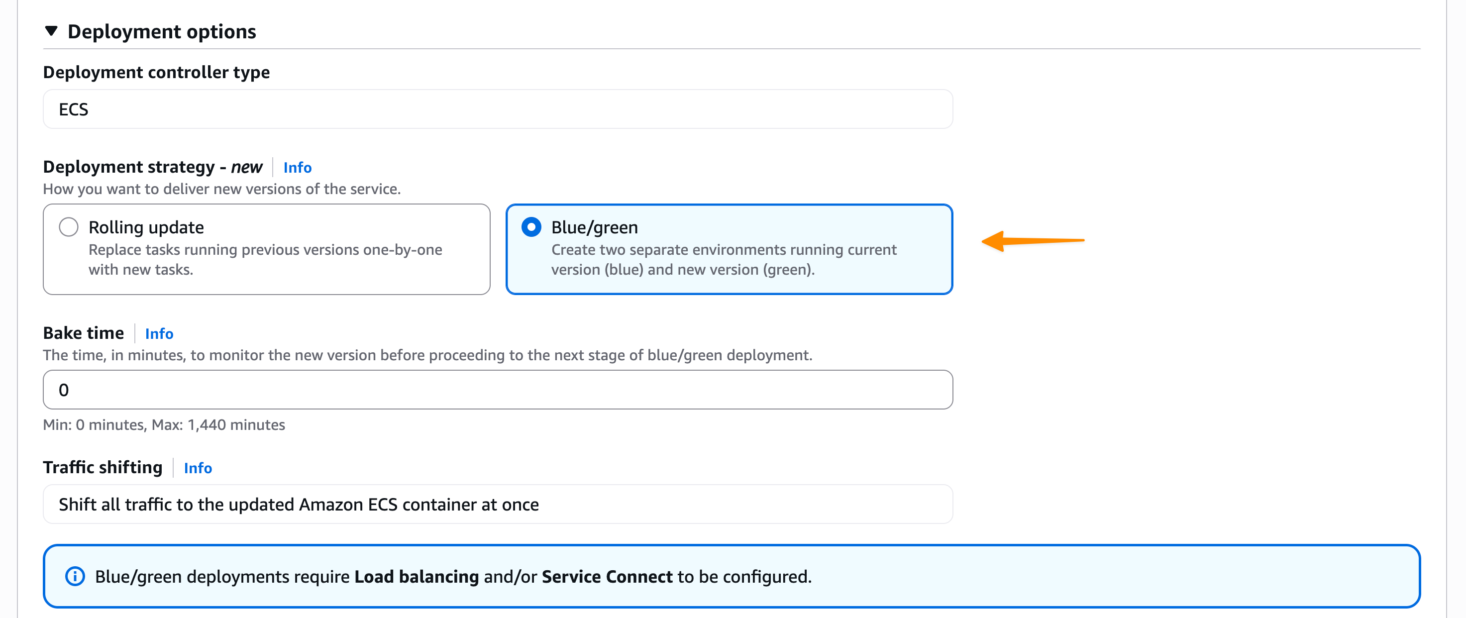在“部署选项”部分,我选择 ECS 作为部署控制器类型,然后选择蓝绿作为部署策略。烘焙时间是指生产流量转移到绿色环境后,可立即回滚到蓝色环境的时间。烘焙时间结束后,蓝色任务将被移除。