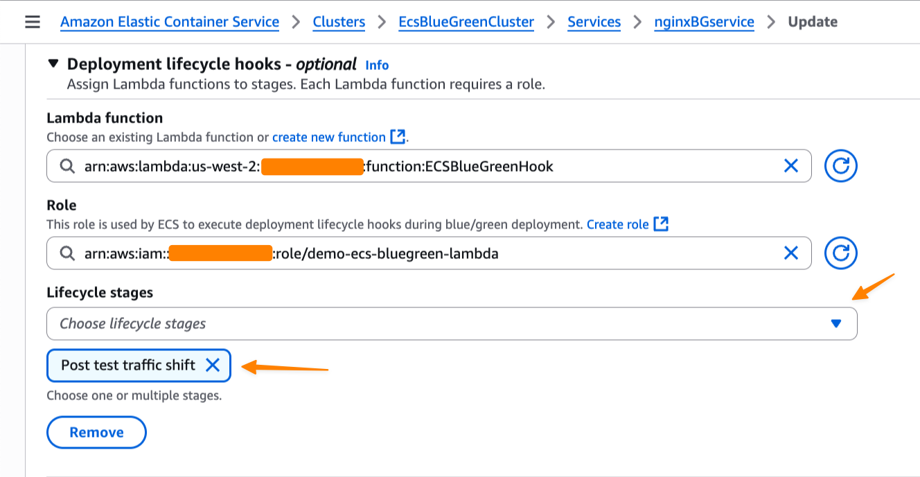 我们还引入了部署生命周期挂钩。这是一种事件驱动的机制,可用于扩展部署工作流。我可以选择要用作部署生命周期挂钩的 AWS Lambda 函数。该 Lambda 函数可以执行所需的业务逻辑,但必须返回钩子状态。