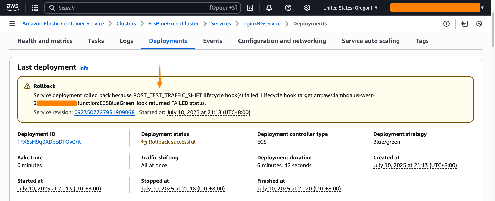 现在,是时候测试我的蓝绿部署了。在本次测试中,Amazon ECS 会在测试流量转移完成后触发我的 Lambda 函数。在这种情况下,我的 Lambda 函数会返回 FAILED(失败),因为它要向我的应用程序执行文件上传操作,而我的应用程序不具备此功能。