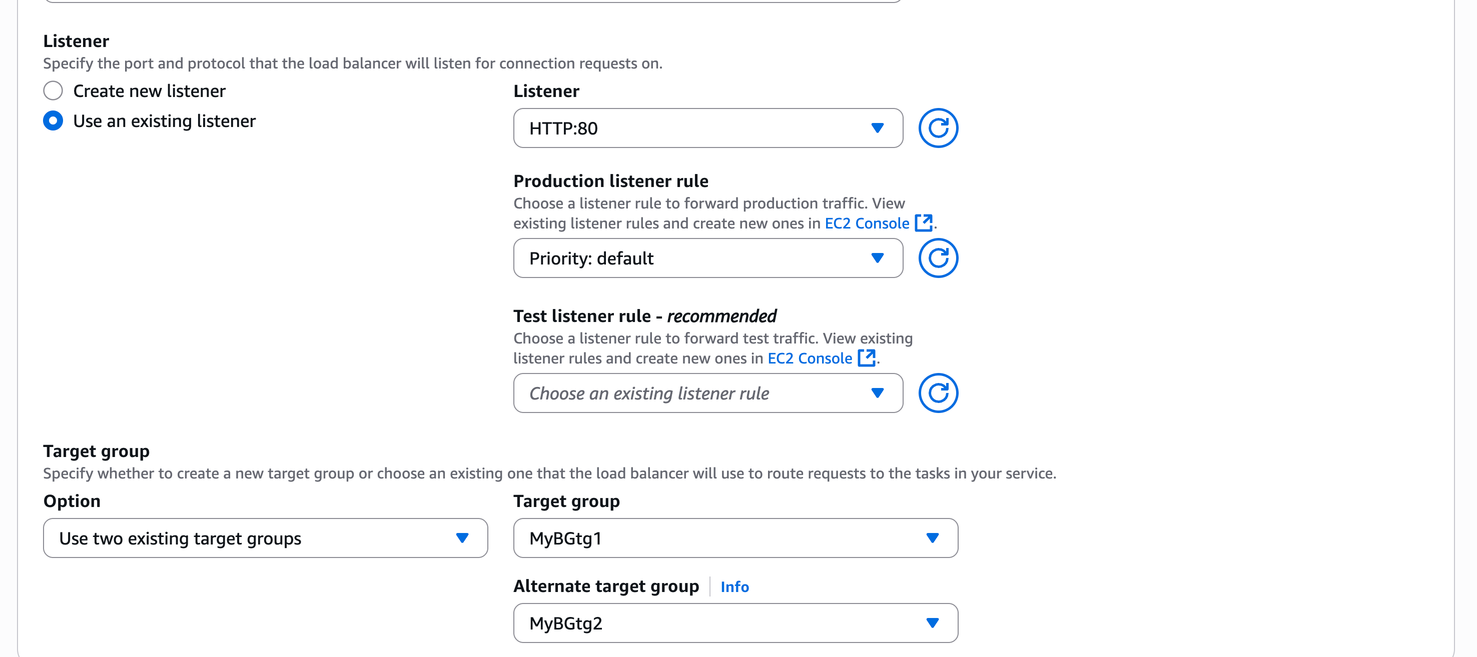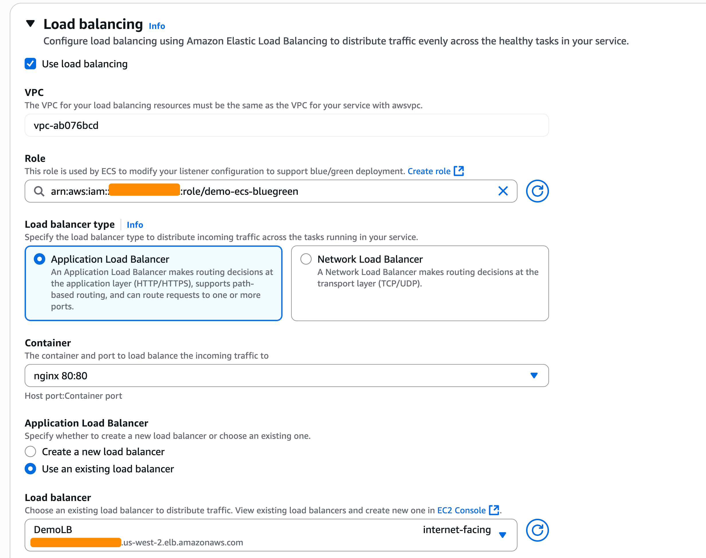 由于我选择了蓝绿部署策略,因此还需要配置负载均衡器和/或 Amazon ECS Service Connect。在负载均衡部分,我选择了我的应用程序负载均衡器。