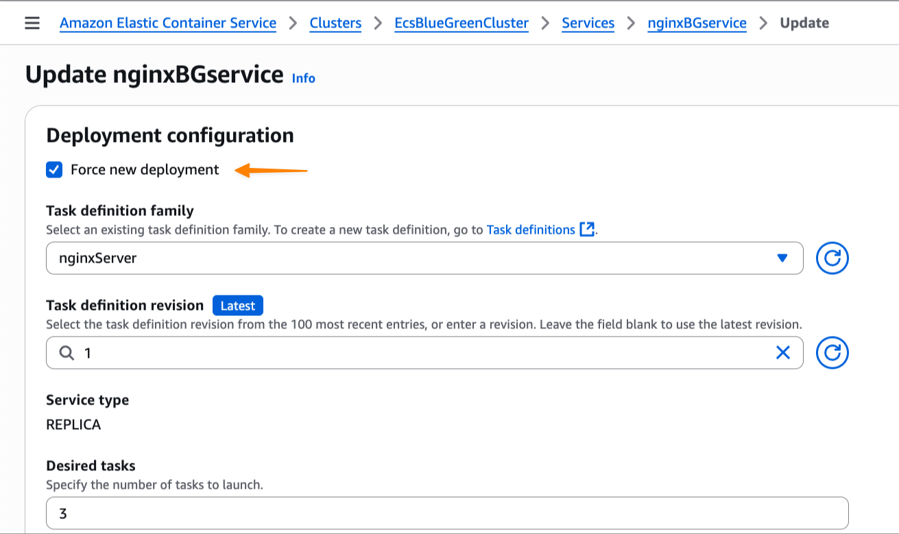 我更新了服务,并勾选了强制执行新部署,因为我知道,如果检测到失败,蓝绿部署功能会进行回滚。我选择这个选项是因为我没有修改任务定义,但仍需要触发新的部署。
