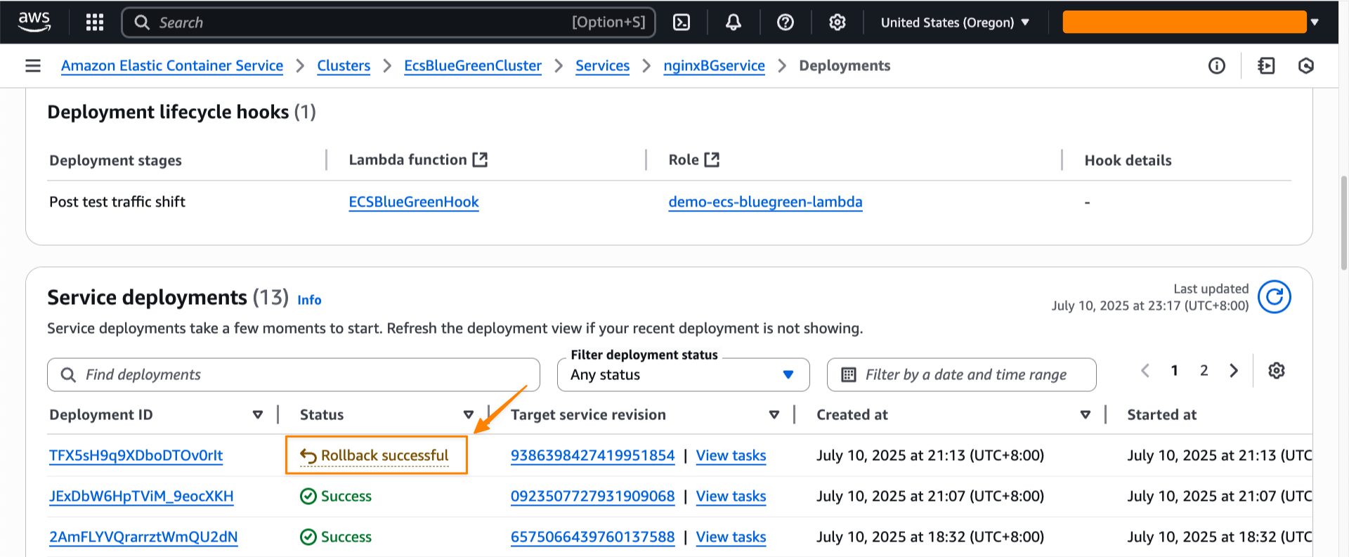 当部署到达与钩子关联的生命周期阶段时,Amazon ECS 会自动调用带有部署上下文的 Lambda 函数。我的验证函数可以对绿色版本运行全面测试 — 检查应用程序运行状况、运行集成测试或验证性能指标。然后,该函数会向 ECS 发出信号,指示是继续部署还是中止部署。