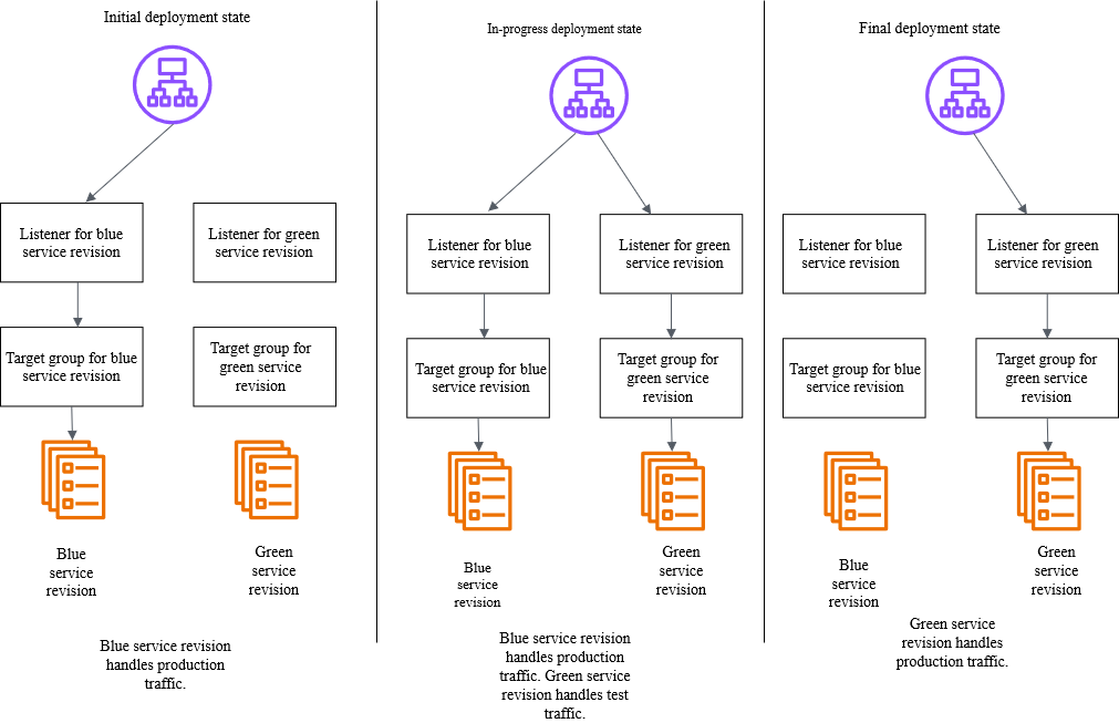 下方的图表描述了蓝绿部署如何将应用程序流量从蓝色环境转移到绿色环境。您可以在 Amazon ECS 蓝绿服务部署工作流页面了解更多信息。