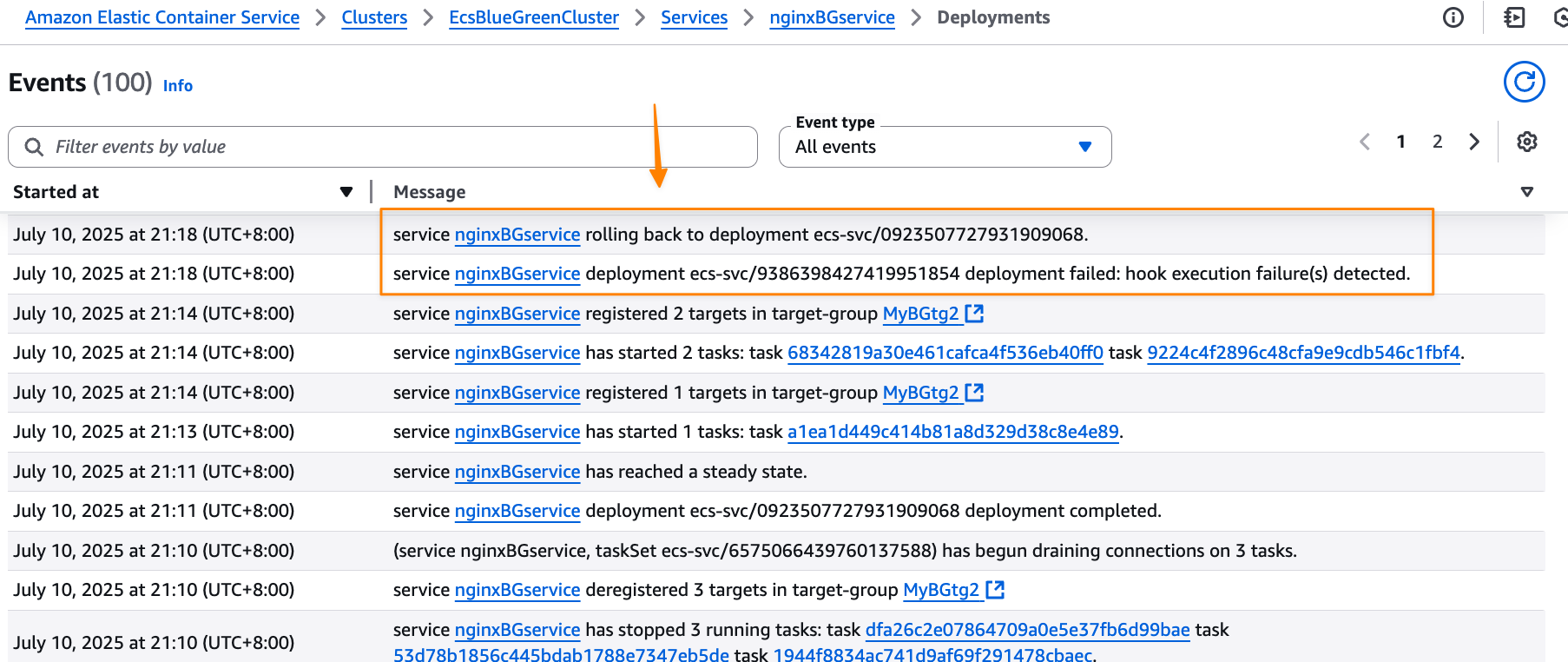由于验证未成功完成,因此 Amazon ECS 尝试回滚到蓝色版本,也就是之前可正常运行的部署版本。我可以通过事件部分的 ECS 事件监控此过程,该部分会详细显示部署进度。