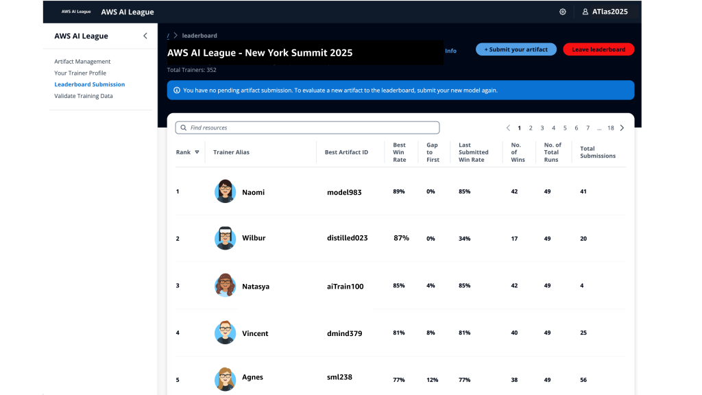 借助 AWS AI League,您的组织可以举办私人锦标赛,团队可以在其中展开协作并运用实用的 AI 技能处理现实世界的业务使用案例。参赛者将精心设计有效的提示词、微调模型,同时构建与自身业务相关的强大生成式人工智能解决方案。在整个竞赛过程中,会根据参考标准对参赛者的解决方案进行评估,实时排行榜会依据准确性和延迟性追踪其表现。