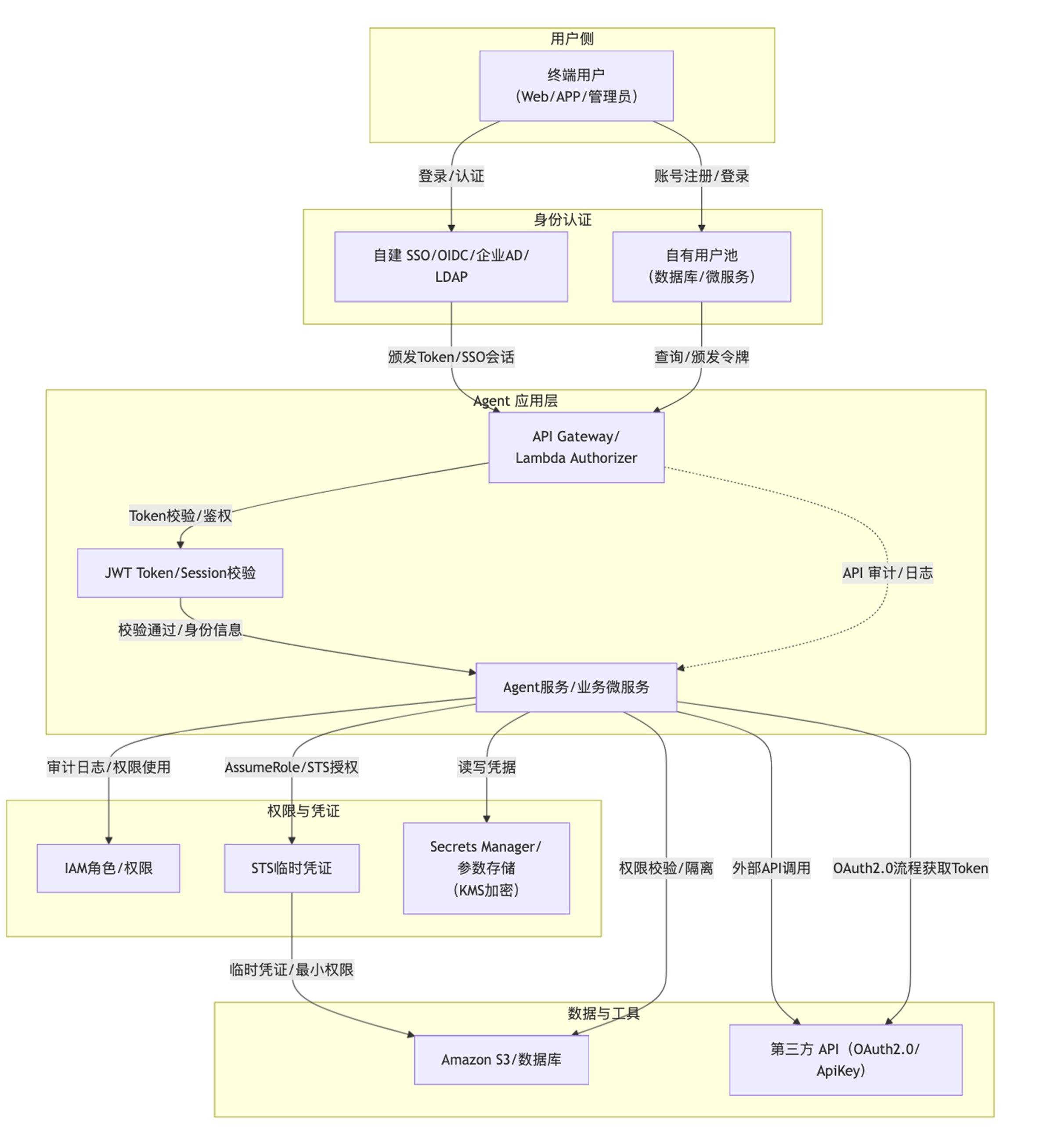 本方案充分结合企业自有 SSO/OIDC/AD、JWT Token、自主用户池、API Gateway、IAM、STS、Secrets Manager 及标准 API 调用链,实现全流程零托管、数据可控、最小权限、合规可审计。架构兼容混合云和本地 IT,便于演进和平滑升级。