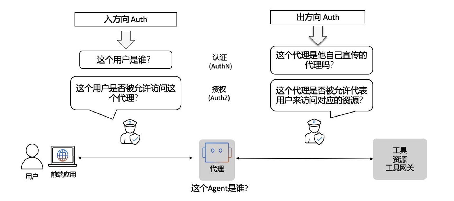 Agent访问外部工具或服务的能力(即出方向):为了配合外部工具或服务对Agent的授权,Agent需要具备 OAuth 客户端的能力,包括2LO和3LO的方式。如果是访问云资源,需要有保存云资源访问短期权限的能力,如IAM role或STS。