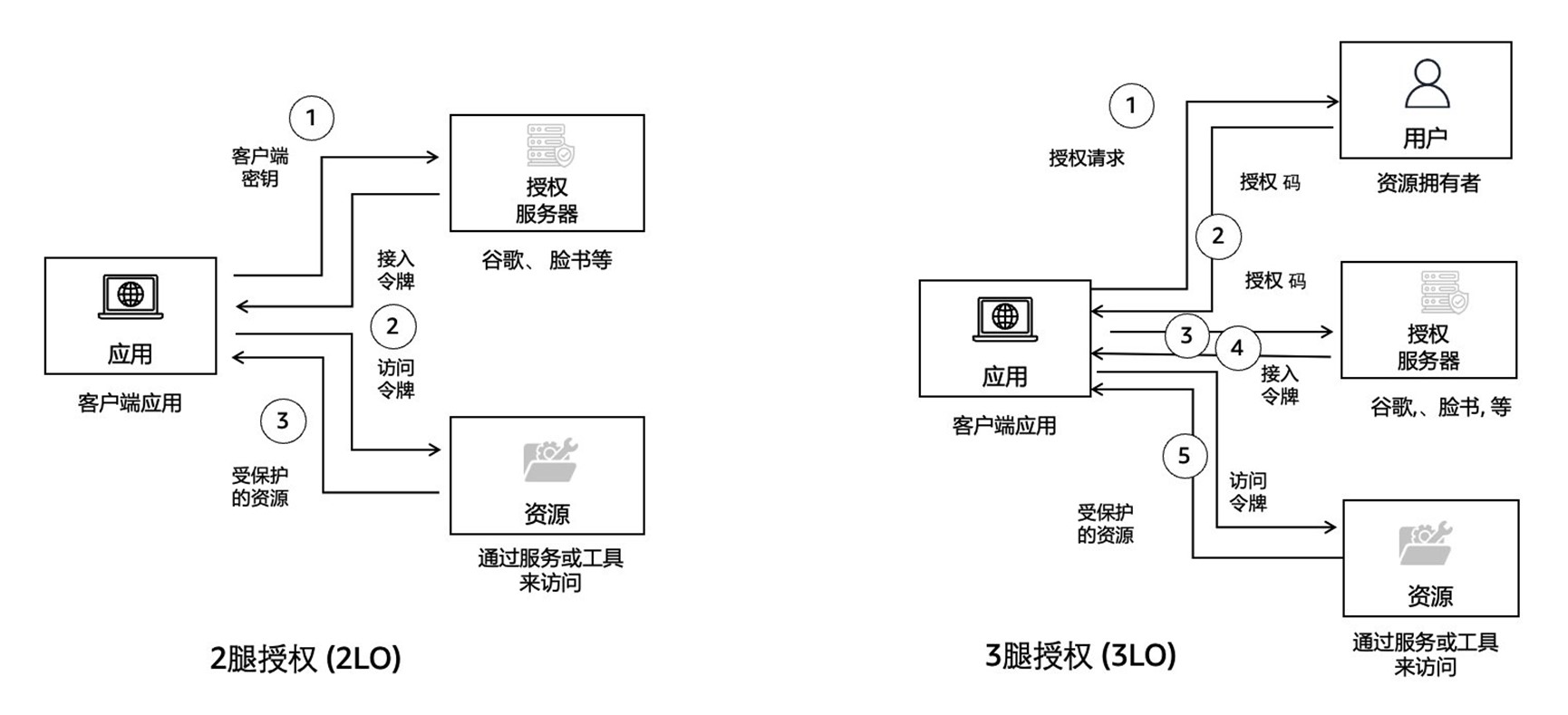 | 3 | OAuth 2.0 client credentials grant (2LO) | OAuth 客户端凭据授予用于无需用户交互的机器对机器身份验证。代理使用 2LO 直接向资源服务器进行身份验证。 |