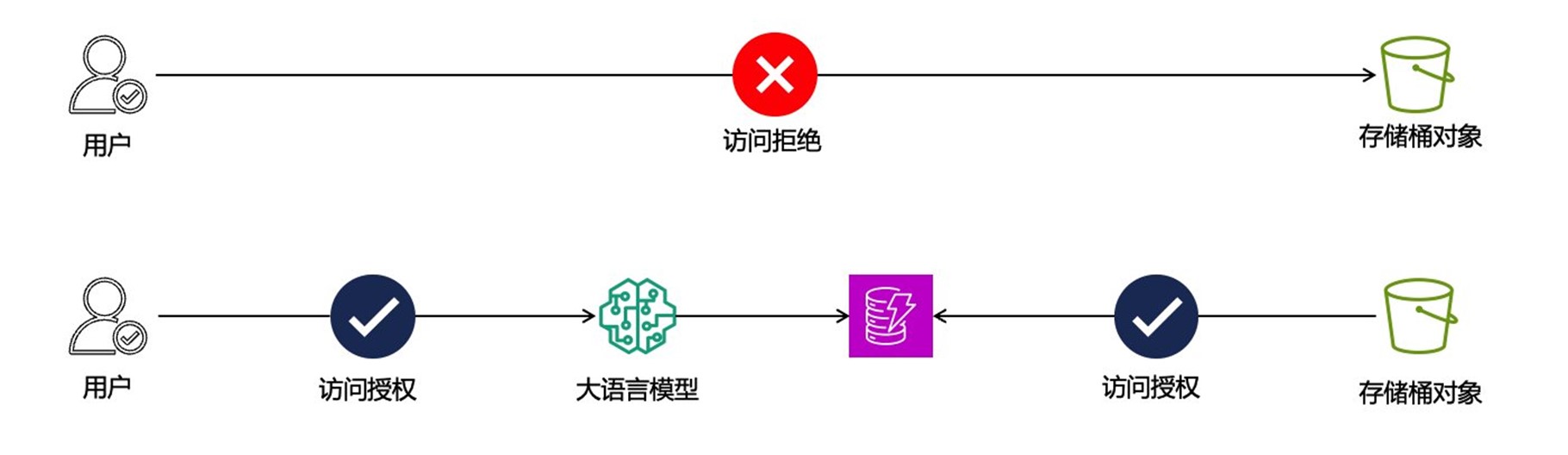 混淆代理问题是AI应用安全中最具挑战性的威胁之一,并把传统的威胁效果放大。这种攻击利用了AI系统的代理特性,通过具有更高权限的AI应用间接获取原本无权访问的资源。攻击的典型场景是:用户直接访问某个资源会被拒绝,但通过AI应用访问同样的资源却能成功,从而绕过了原有的安全控制。混淆代理安全威胁示例:直接访问 S3 存储桶的用户会被拒绝访问;但访问 LLM 的用户(使用 RAG 并存储来自同一 S3 存储桶的数据)则会获得访问权限。