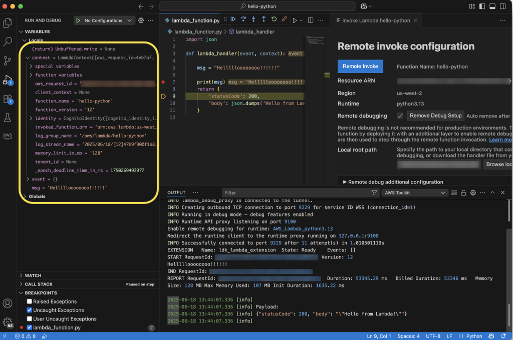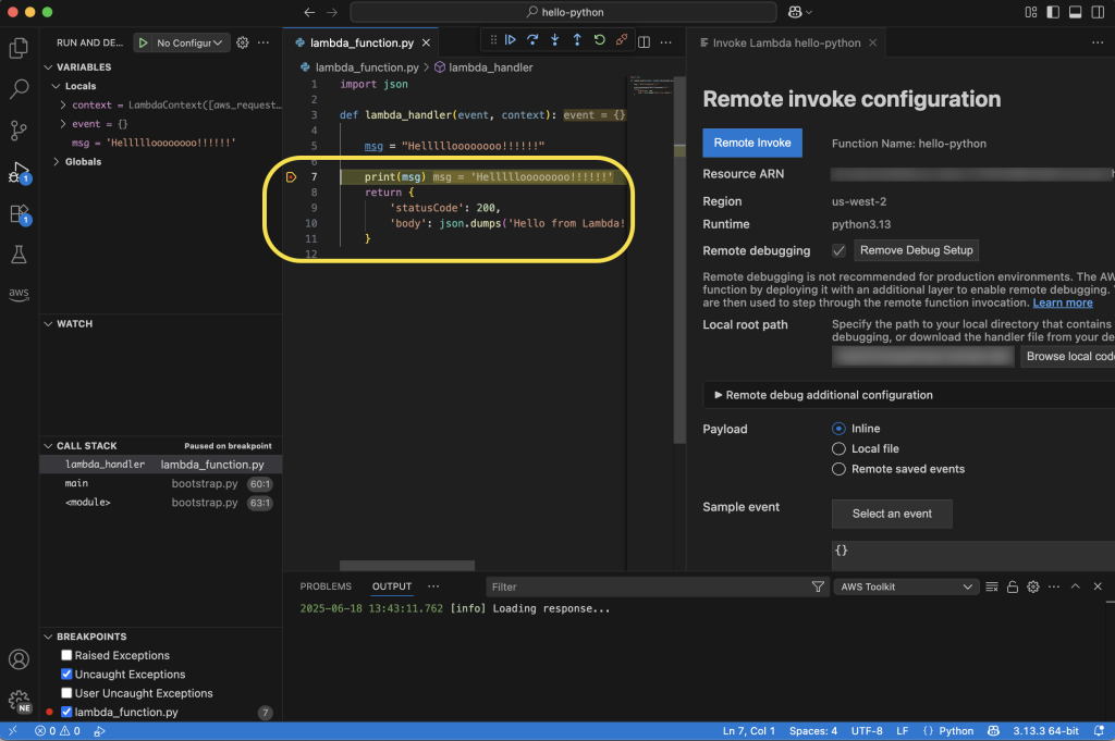 代码调用后将在云端运行,我可以在 VS Code 中实时监控状态。在下面的屏幕截图中,您可以看到我在 print 语句处设置了断点。函数执行将在此暂停,我可以检查局部变量值等,然后选择继续到下一个断点或逐行执行代码。