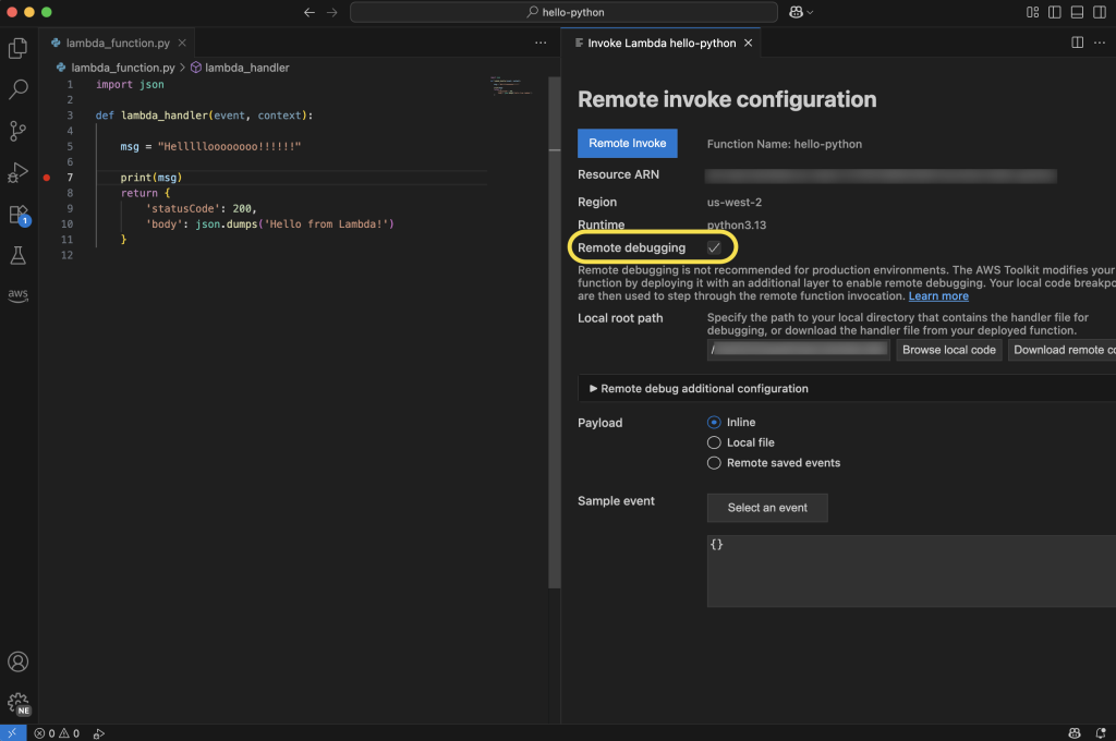 开始远程调试非常简单。开发人员在 VS Code 中选择 Lambda 函数,即可在数秒内启用调试。AWS Toolkit for VS Code 会自动下载函数代码、建立安全调试连接并启用断点设置。调试完成后,AWS Toolkit for VS Code 会自动清理调试配置,以防止对生产流量产生任何影响。