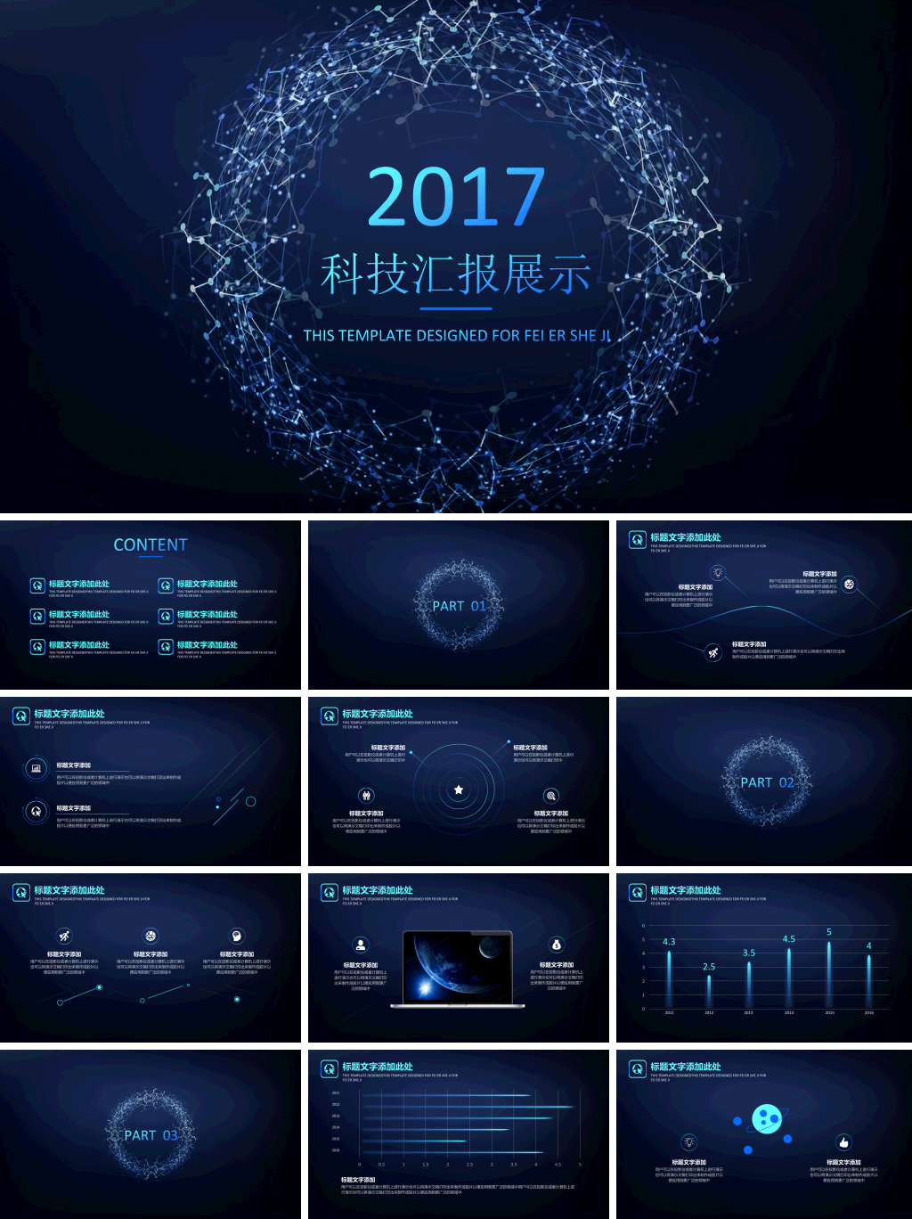 本套深蓝科技行业汇报PPT模板,模板编号:P13255,大小10MB,共27页,比例为16:9,由封面、目录、转场页、内容、结尾5个部分构成。