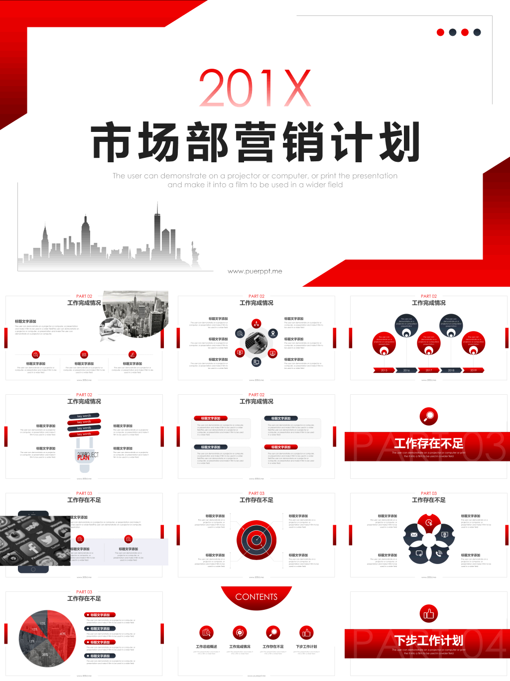 本套红色简约大气市场部营销计划PPT模板,模板编号:P12379,大小10MB,共27页,比例为16:9,由封面、目录、转场页、内容、结尾5个部分构成。