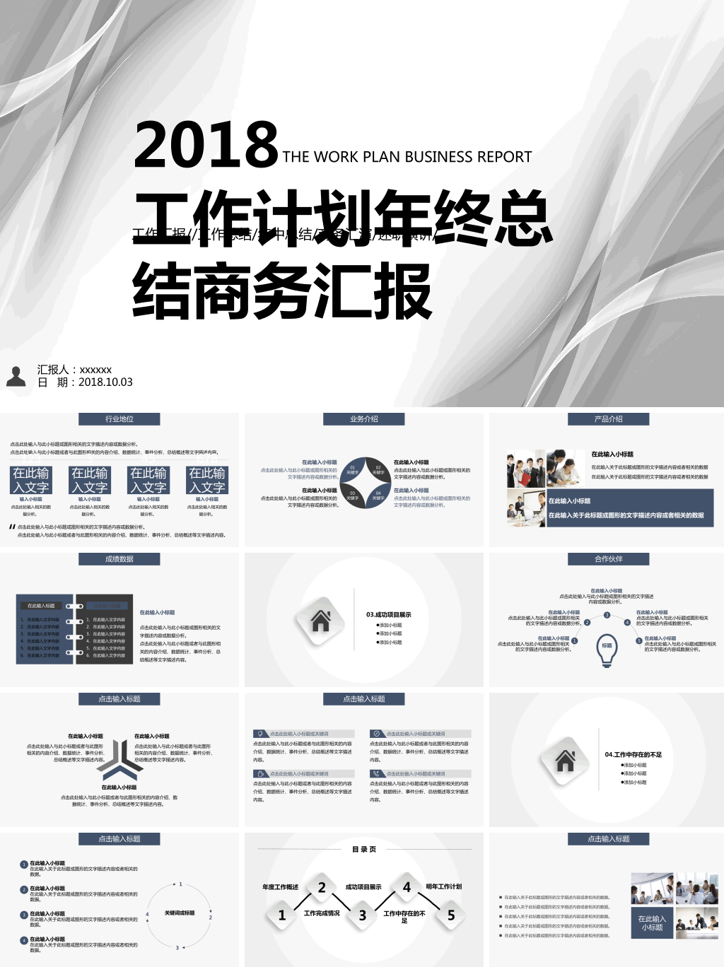 此银灰色工作计划及年终总结商务PPT模板,共27页,包含动态播放效果,适用于汇报演讲,可编辑内容及页面。