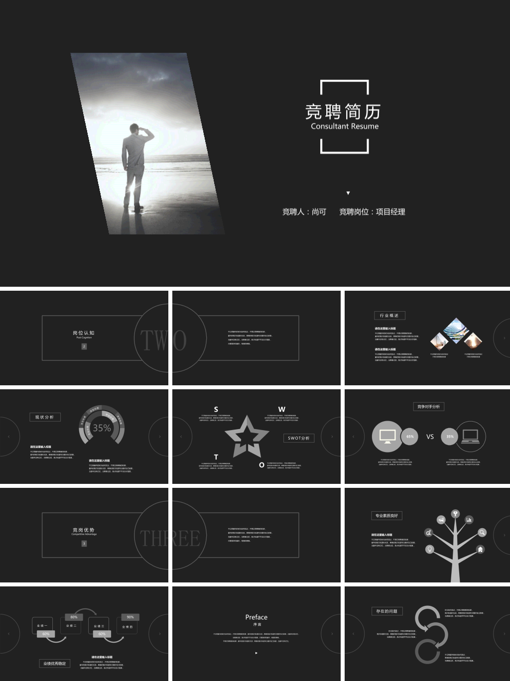 本套企业内部岗位晋升简历PPT模板共有27页,包括封面、目录等5个部分,采用16:9比例设计,内含灰色配色,支持动态播放效果。模板为源文件,可编辑文字及图片,适用于演讲汇报。