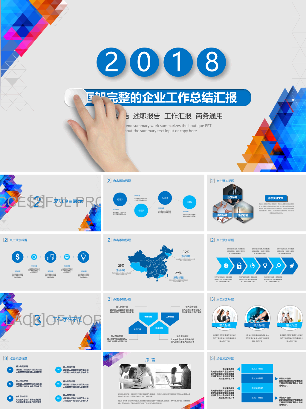 内含蓝色,灰色,红色多种配色,精美商务风,酷炫风格设计,动态播放效果,精美实用。