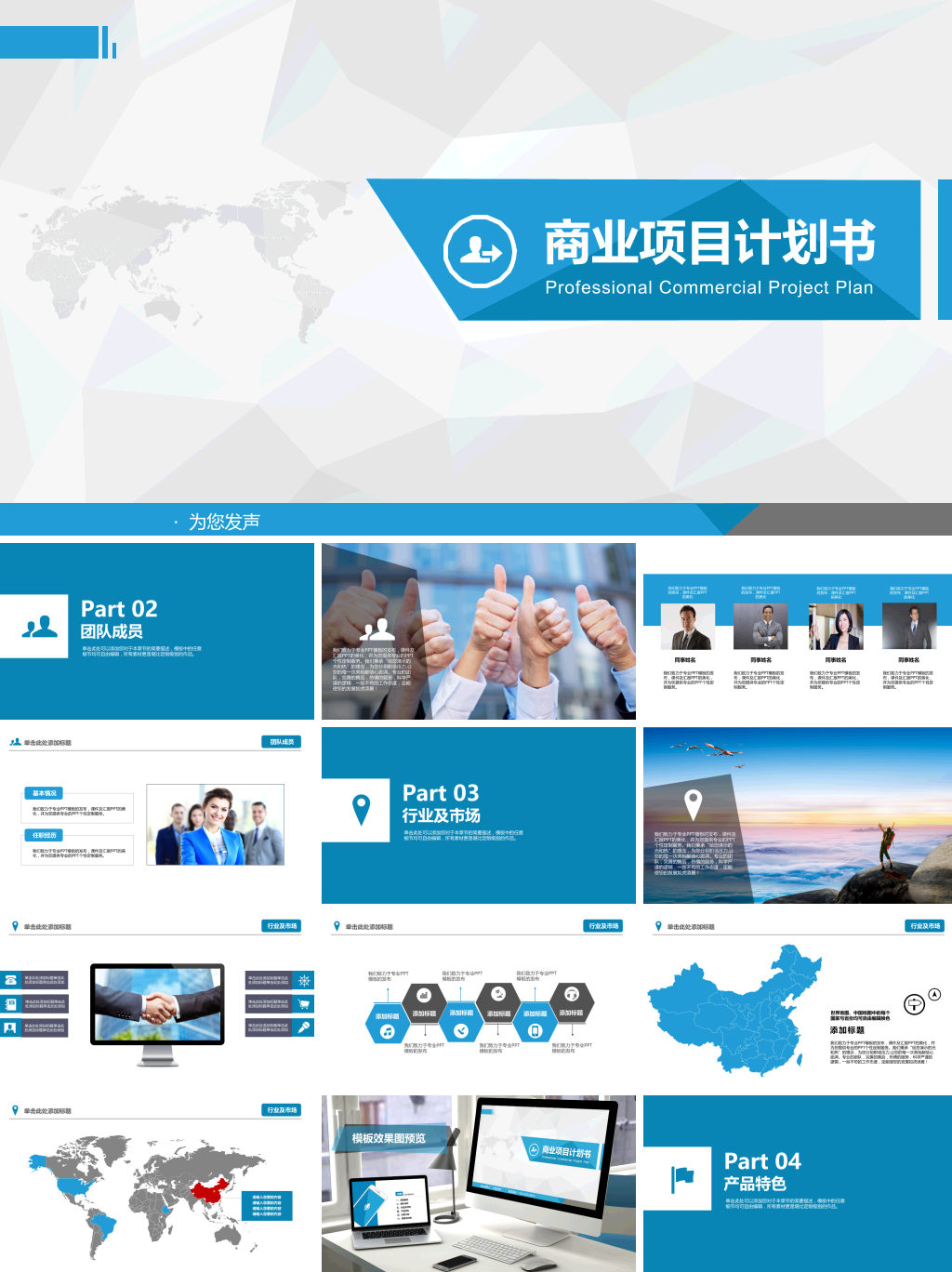 本套商业项目计划PPT模板,模板编号:P18757,大小10MB,共27页,比例为16:9,由封面、目录、转场页、内容、结尾5个部分构成。