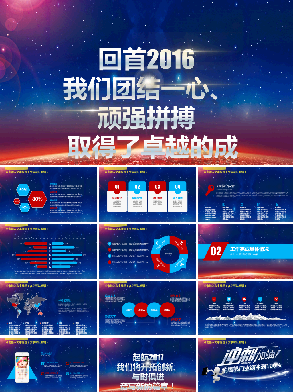 内含蓝色,灰色,红色多种配色,精美酷炫风格设计,动态播放效果,精美实用。