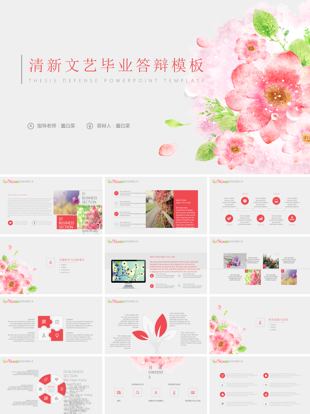 本套PPT模板采用清新文艺风格设计,适用于毕业答辩场景,包含27页内容,支持动态播放效果。模板提供多种配色方案,用户可根据需求编辑文字与图片。