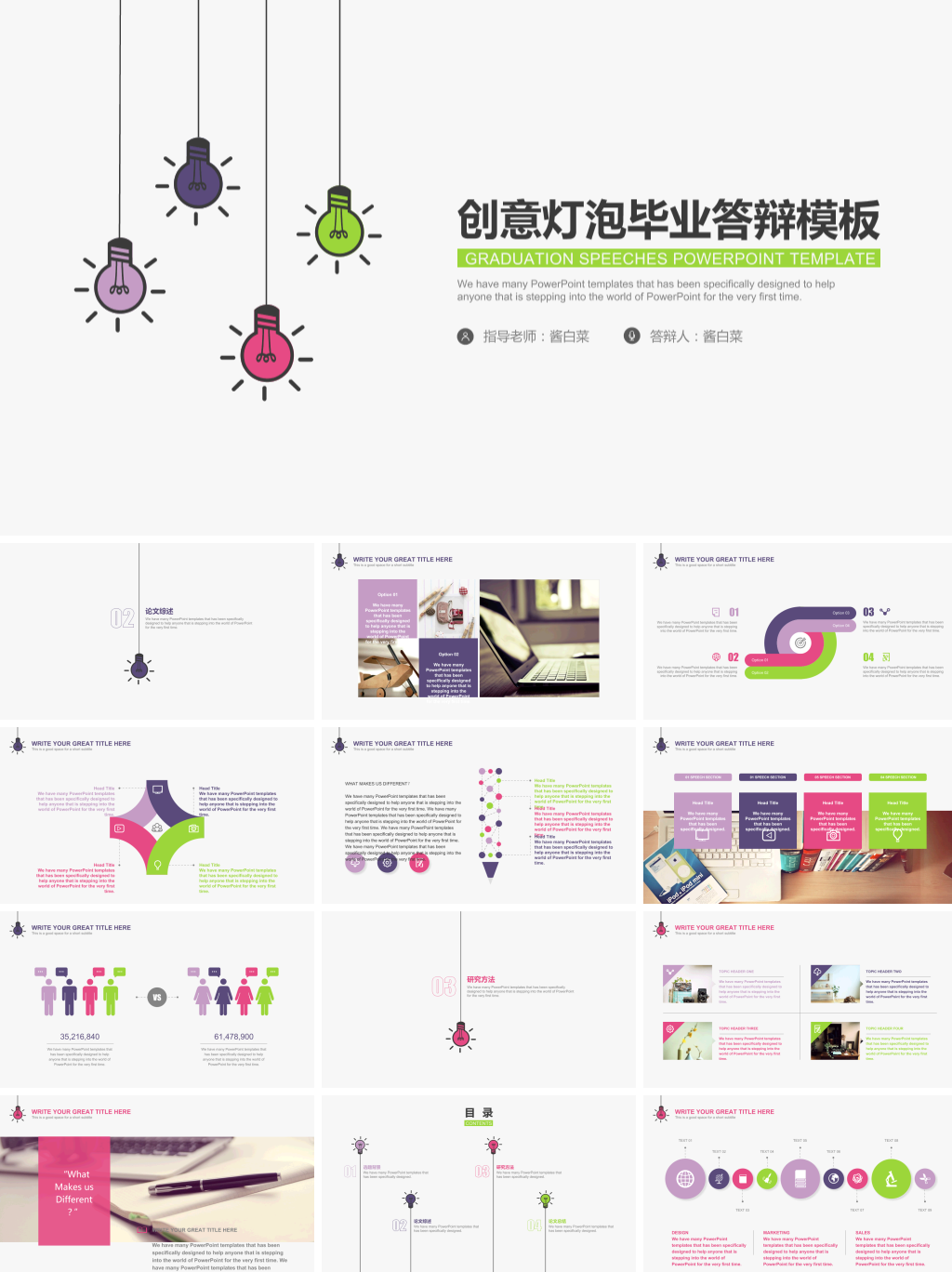 本套创意灯泡毕业答辩PPT模板共27页,包含灰色、绿色等多种配色,采用精美扁平化风格设计,支持动态播放效果。模板大小10MB,比例为16:9,分为封面、目录等5个部分。该模板为源文件,内容及页面均可按需编辑。