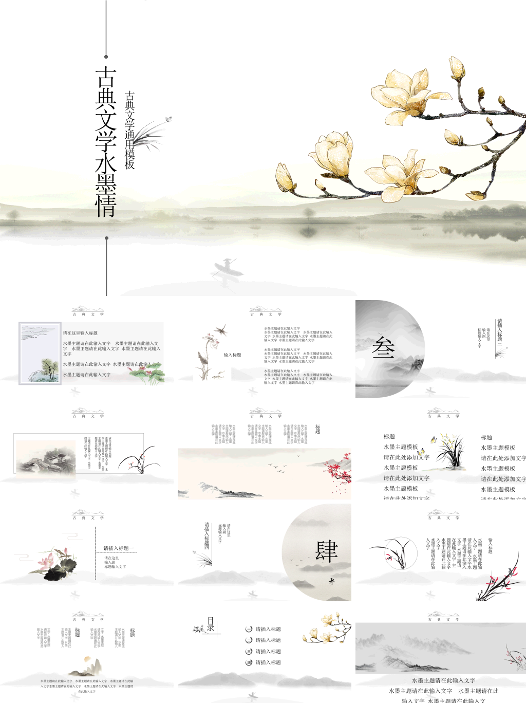 本套古典文学通用PPT模板,模板编号:P99658,大小10MB,共27页,比例为16:9,由封面、目录、转场页、内容、结尾5个部分构成。