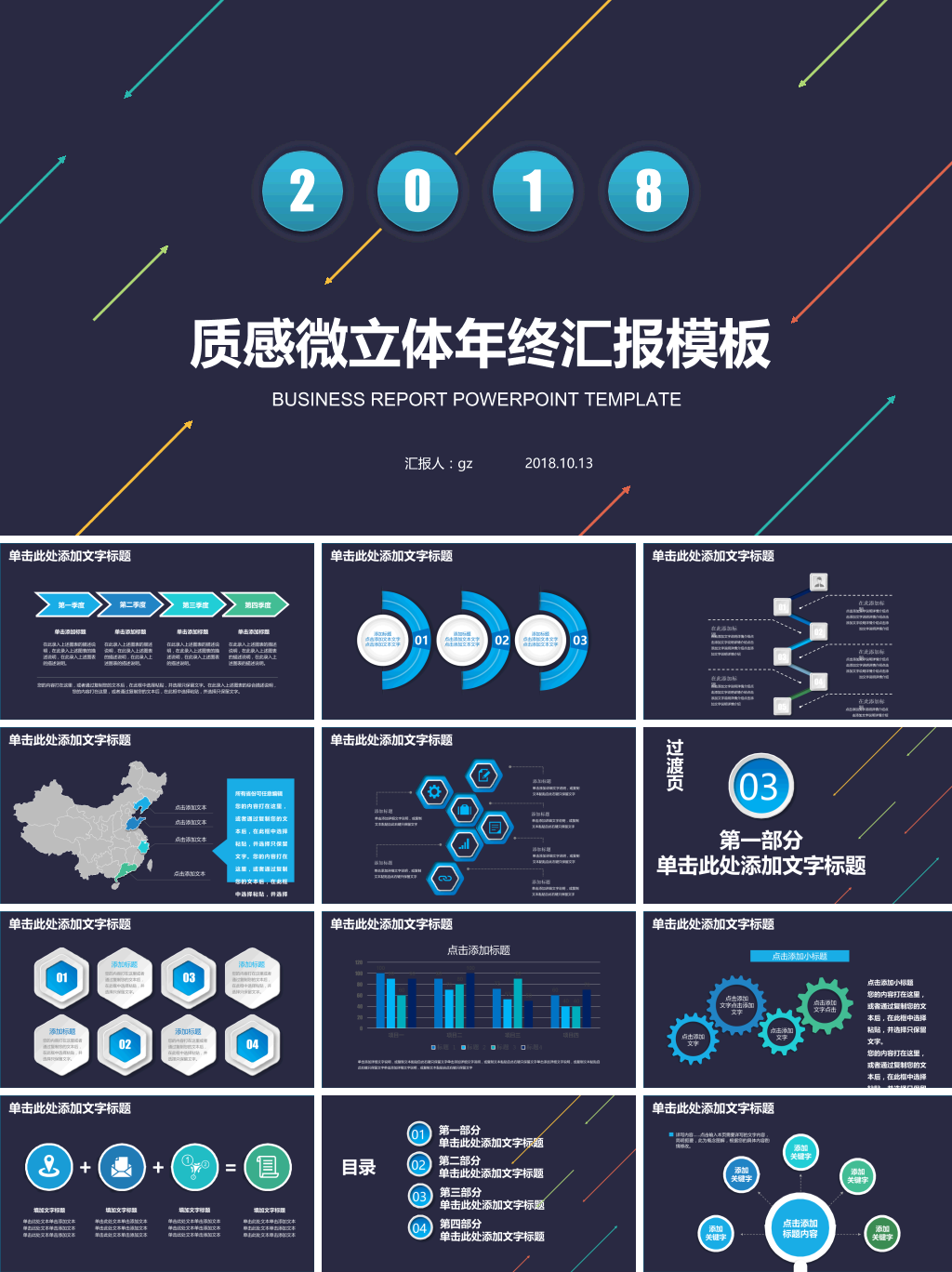 内含青色,橙色,蓝色多种配色,精美小清新,微立体,酷炫,另类,文艺风格设计,动态播放效果,精美实用。