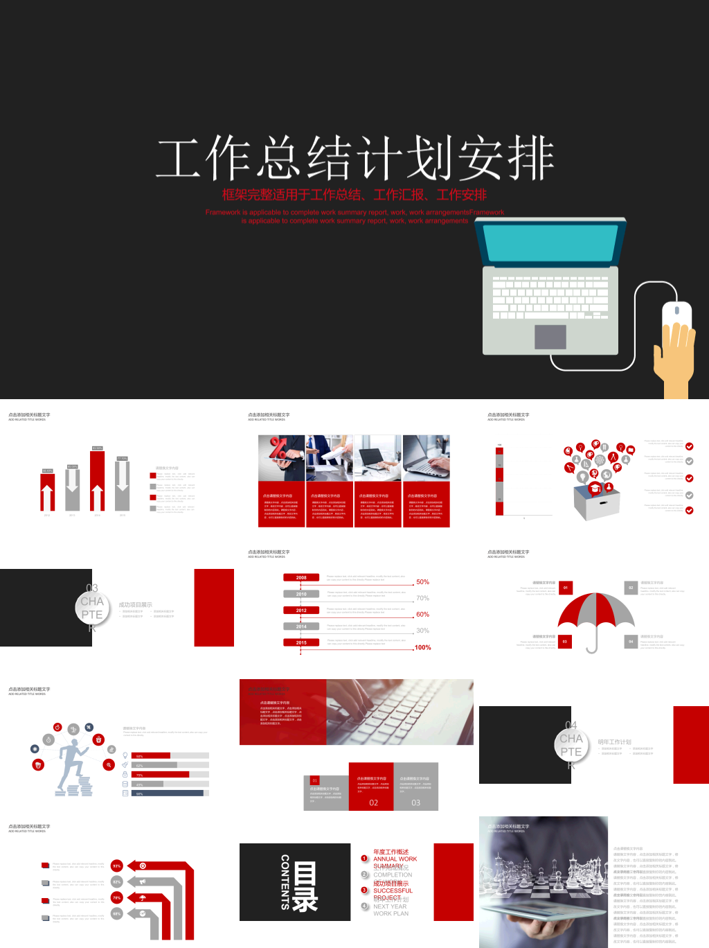 内含灰色,红色多种配色,精美扁平化风格设计,动态播放效果,精美实用。