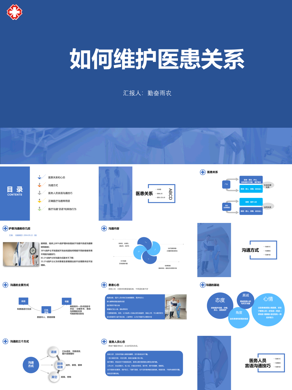 本套医患沟通PPT模板,模板编号:P83931,大小10MB,共27页,比例为16:9,由封面、目录、转场页、内容、结尾5个部分构成。