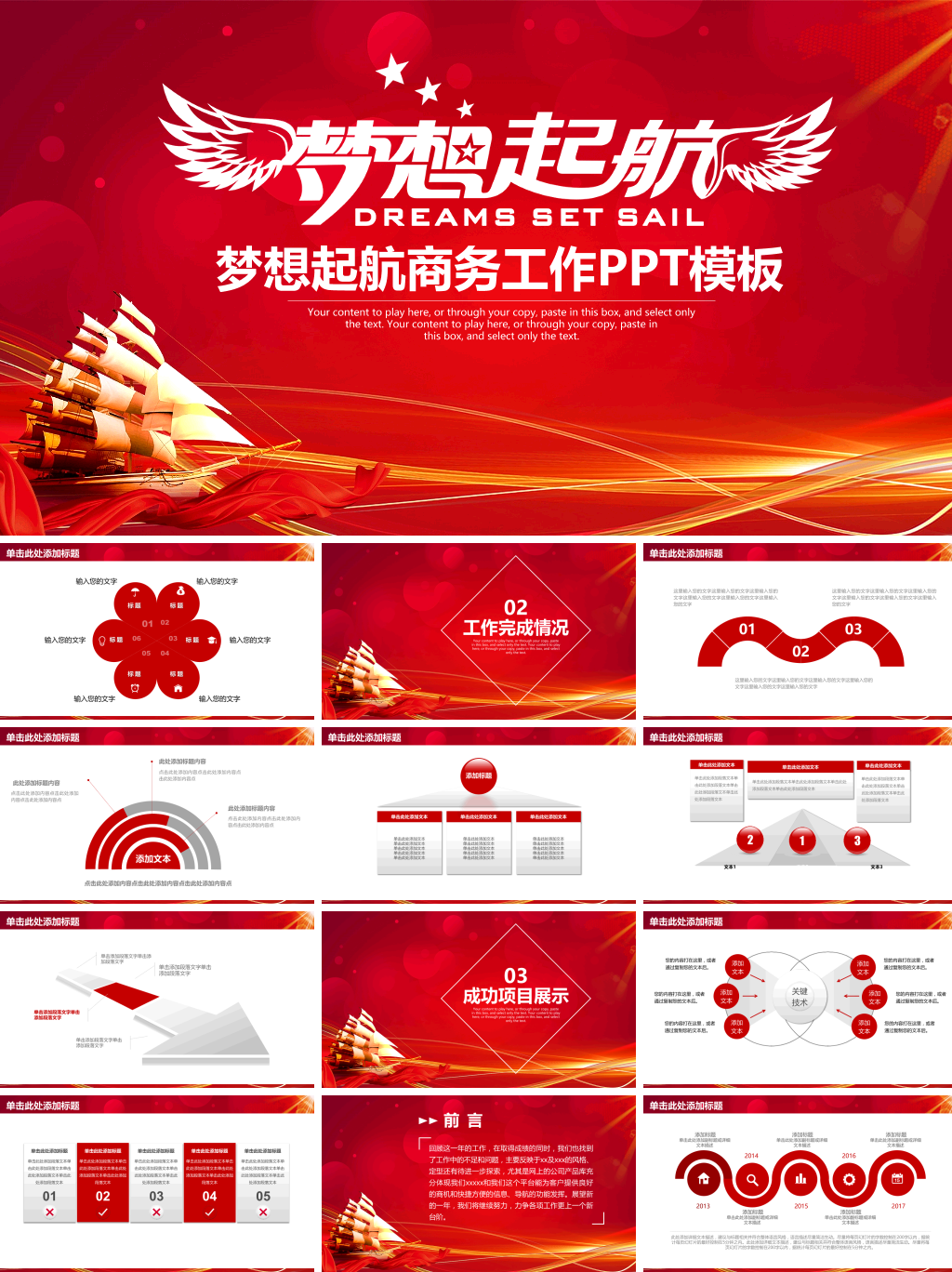 本套梦想起航商务工作PPT模板,模板编号:P99594,大小10MB,共27页,比例为16:9,由封面、目录、转场页、内容、结尾5个部分构成。
