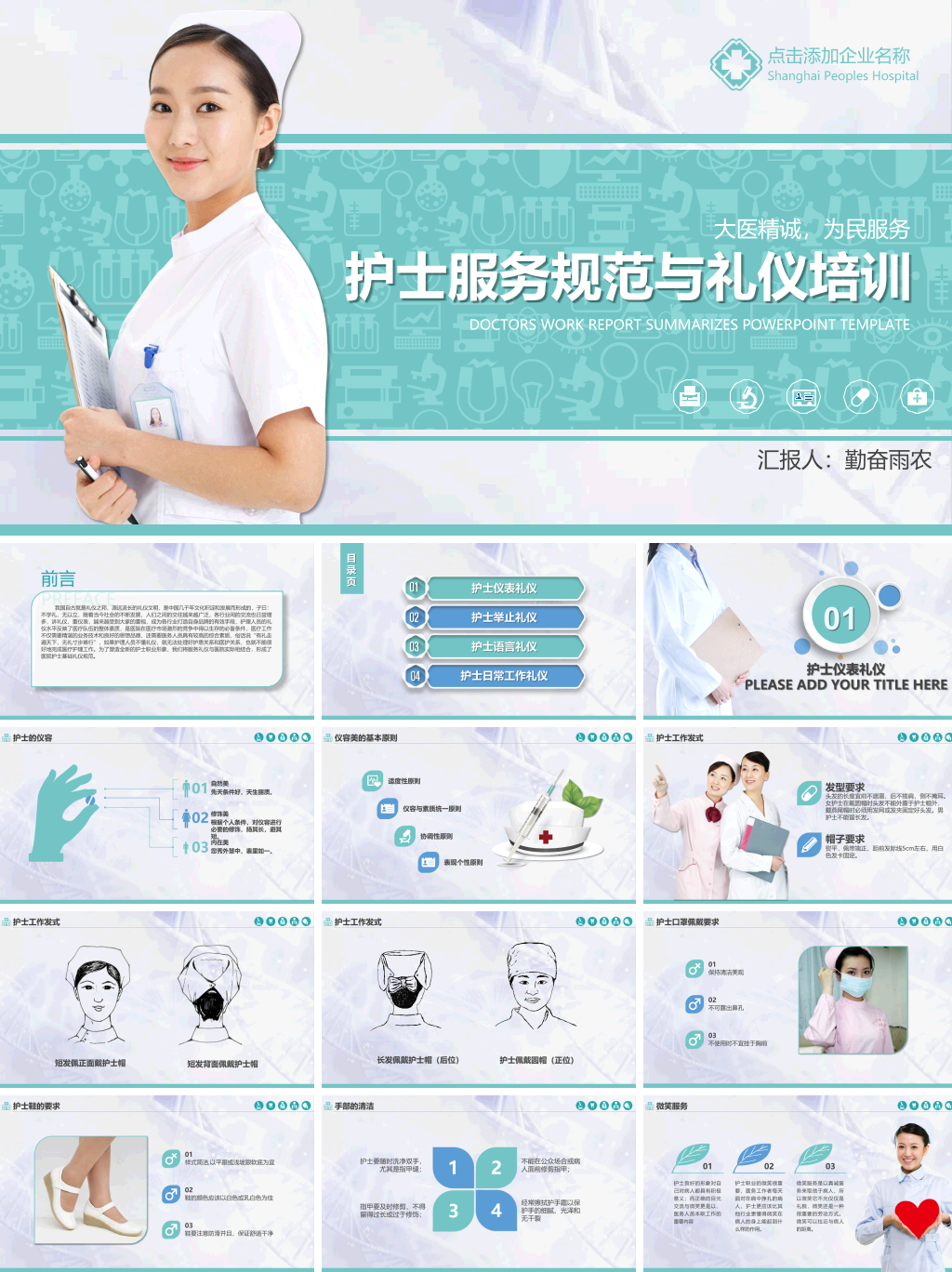 本文档介绍了一套专为护士设计的服务规范与礼仪PPT模板,包含青、橙、灰等多种配色,动态效果丰富,易于编辑。通过精心设计,能助力护士在演讲中展现专业风采。