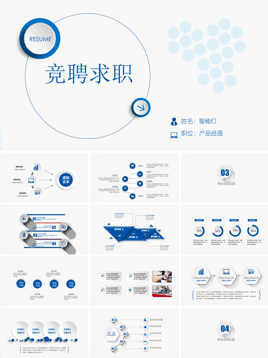 内含蓝色多种配色,精美微立体风格设计,动态播放效果,精美实用。