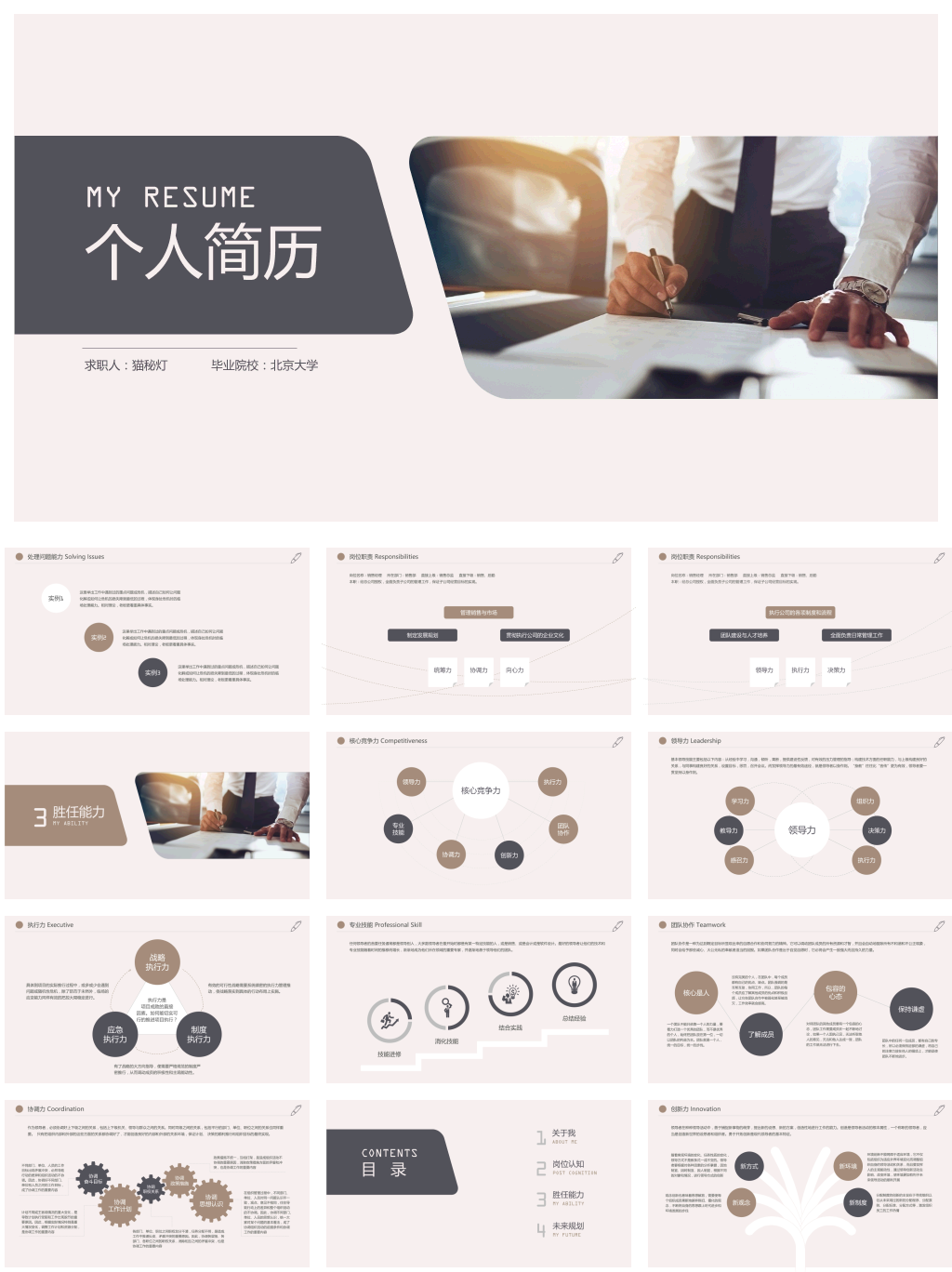 本套高端商务个人求职简历PPT模板,模板编号:P78675,大小10MB,共27页,比例为16:9,由封面、目录、转场页、内容、结尾5个部分构成。
