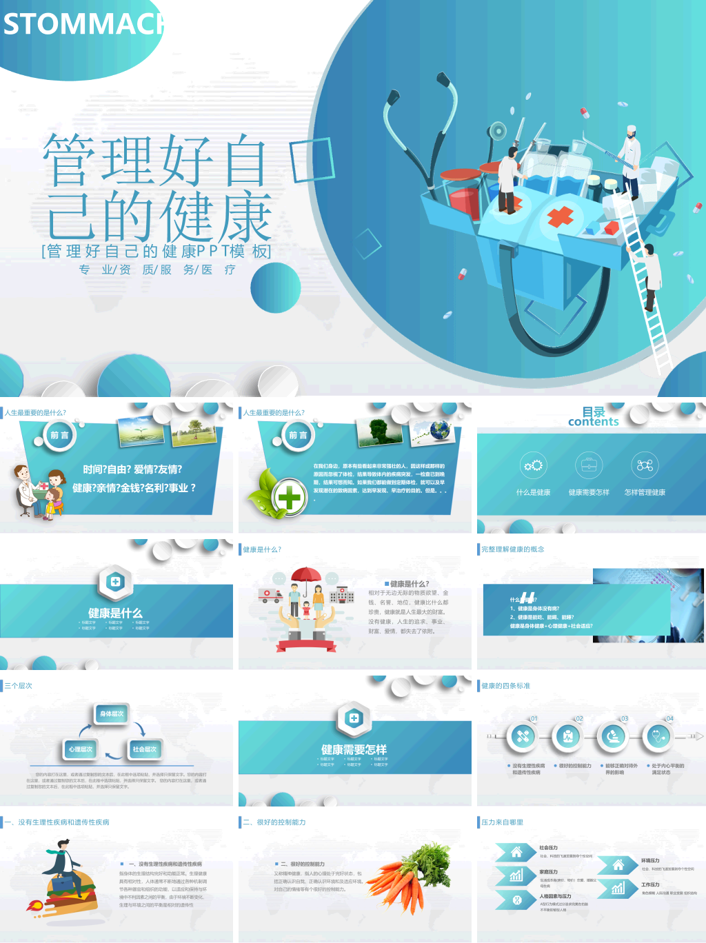 本套管理好自己的健康下载PPT模板,模板编号:P87161,大小10MB,共27页,比例为16:9,由封面、目录、转场页、内容、结尾5个部分构成。